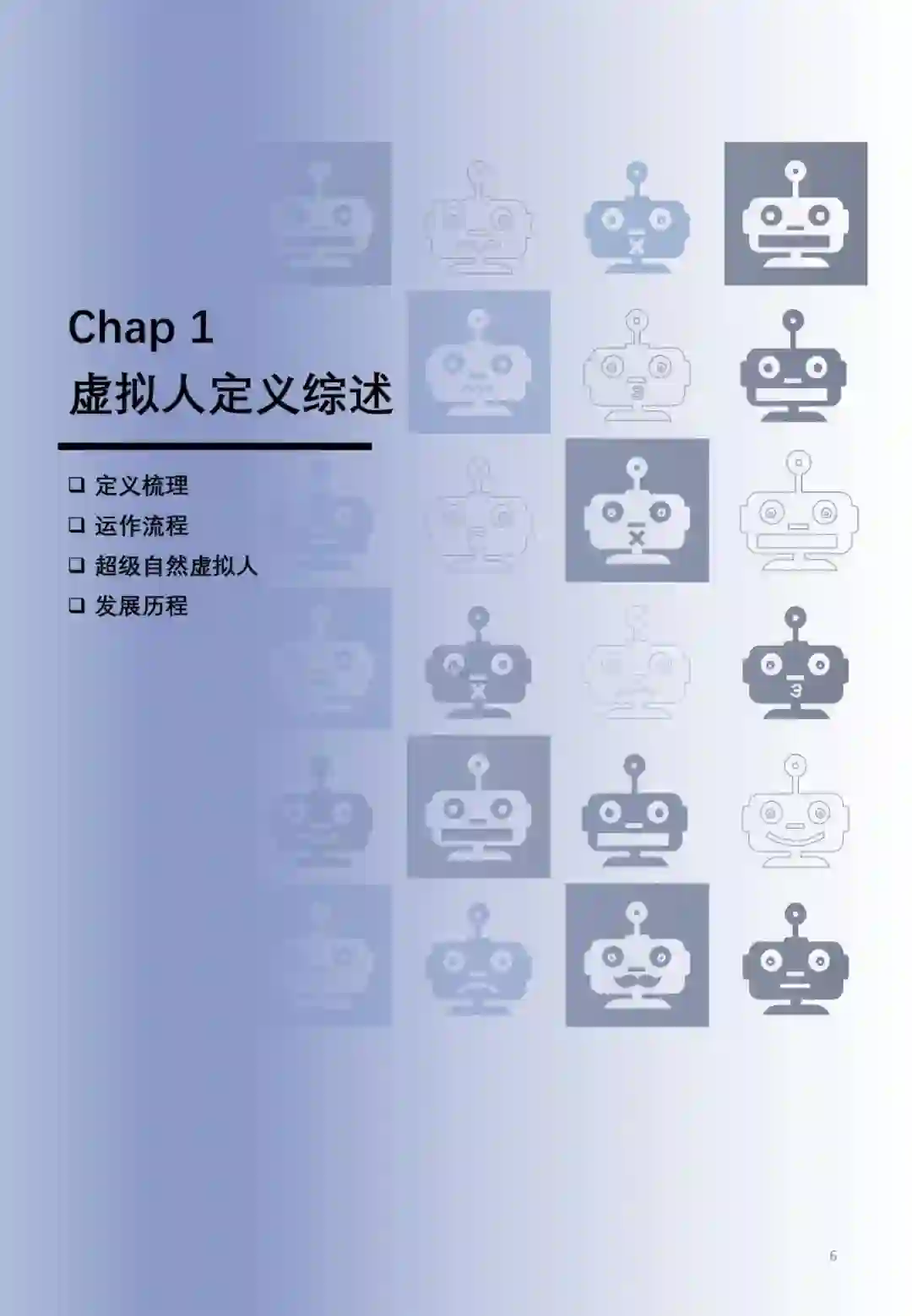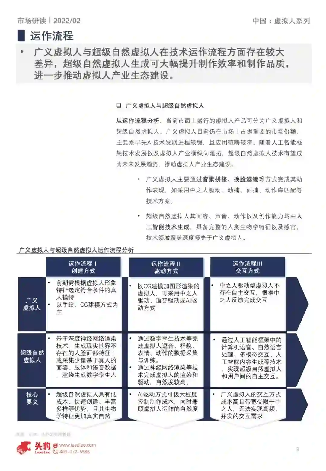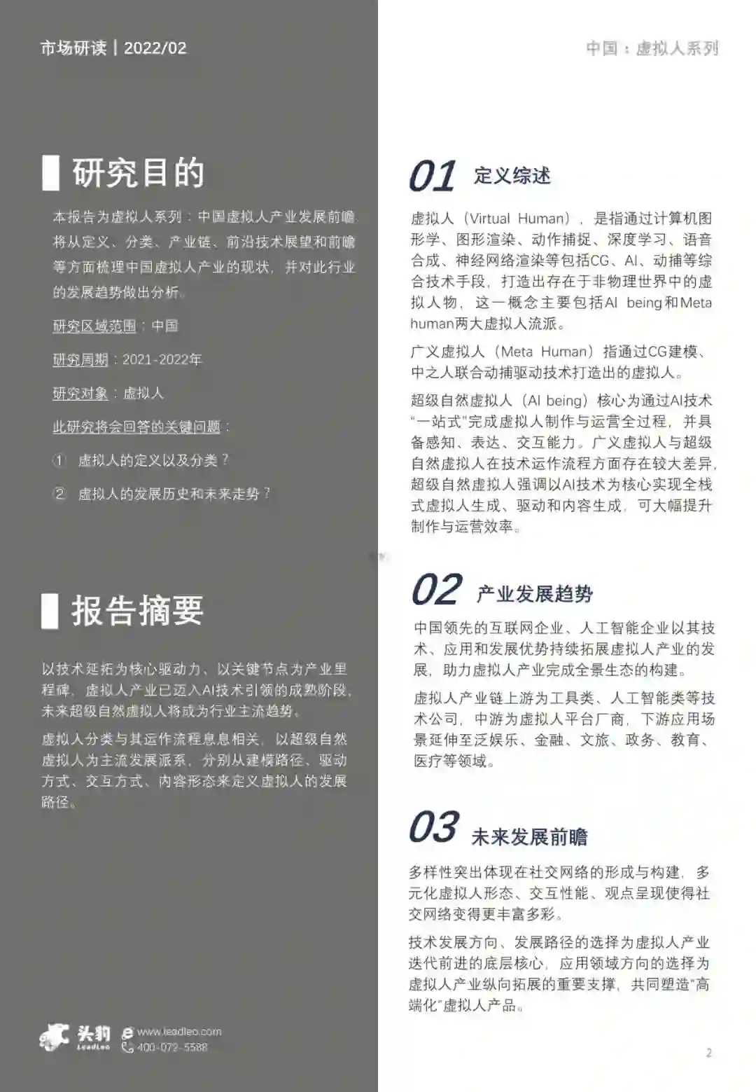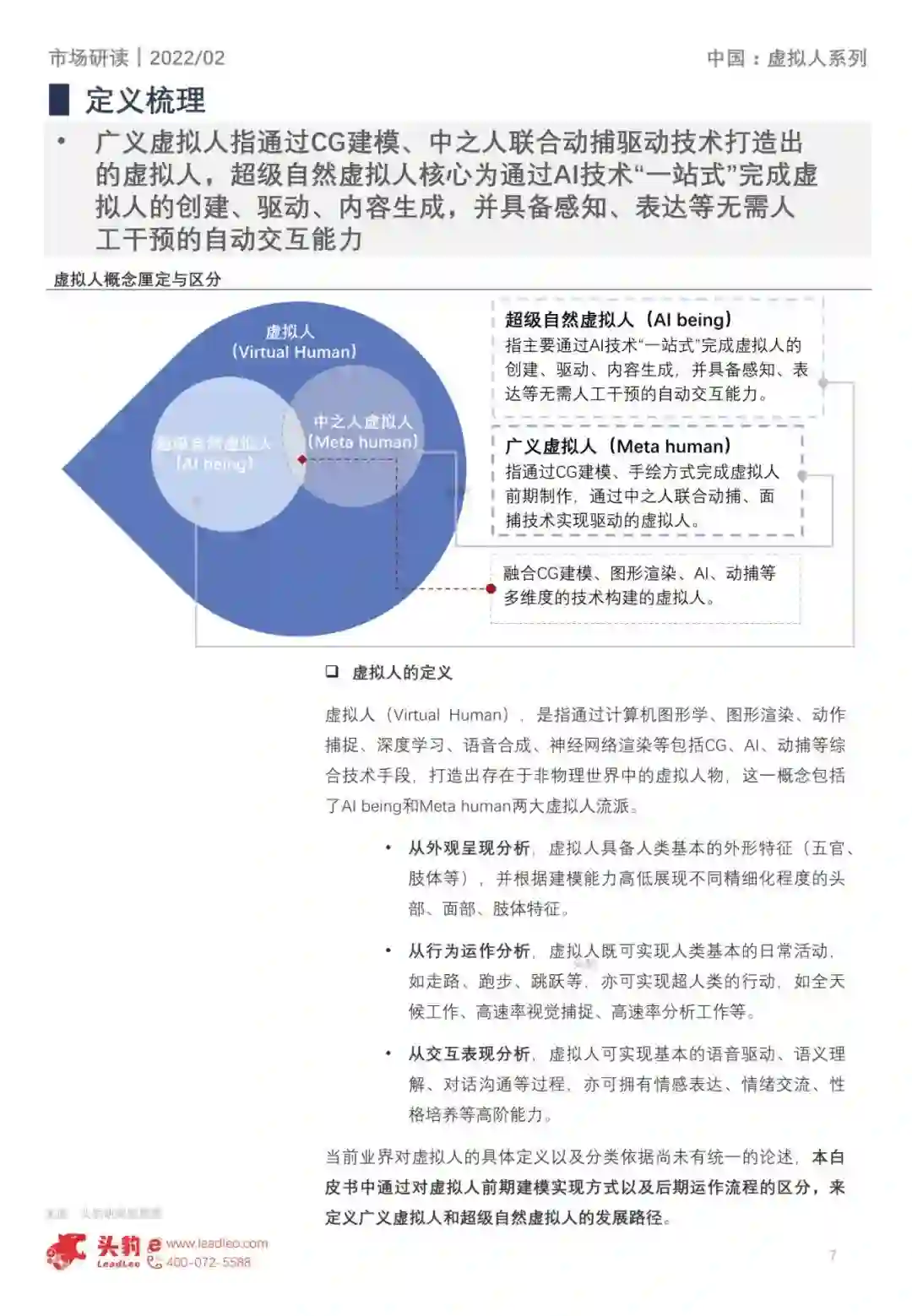 虚拟人(Virtual Human),是指通过计算机图 形学、图形渲染、动作捕捉、深度学习、语音 合成、神经网络渲染等包括CG、AI、动捕等综 合技术手段,打造出存在于非物理世界中的虚 拟人物,这一概念主要包括AI being和Meta human两大虚拟人流派。 广义虚拟人(Meta Human)指通过CG建模、 中之人联合动捕驱动技术打造出的虚拟人 超级自然虚拟人(AI being)核心为通过AI技术 “一站式”完成虚拟人制作与运营全过程,并具 备感知、表达、交互能力。广义虚拟人与超级 自然虚拟人在技术运作流程方面存在较大差异, 超级自然虚拟人强调以AI技术为核心实现全栈 式虚拟人生成、驱动和内容生成,可大幅提升 制作与运营效率。 2. 产业发展趋势 中国领先的互联网企业、人工智能企业以其技 术、应用和发展优势持续拓展虚拟人产业的发 展,助力虚拟人产业完成全景生态的构建。 虚拟人产业链上游为工具类、人工智能类等技 术公司,中游为虚拟人平台厂商,下游应用场 景延伸至泛娱乐、金融、文旅、政务、教育、 医疗等领域。 3. 未来发展前瞻 多样性突出体现在社交网络的形成与构建,多 元化虚拟人形态、交互性能、观点呈现使得社 交网络变得更丰富多彩。 技术发展方向、发展路径的选择为虚拟人产业 迭代前进的底层核心,应用领域方向的选择为 虚拟人产业纵向拓展的重要支撑,共同塑造“高 端化”虚拟人产品。