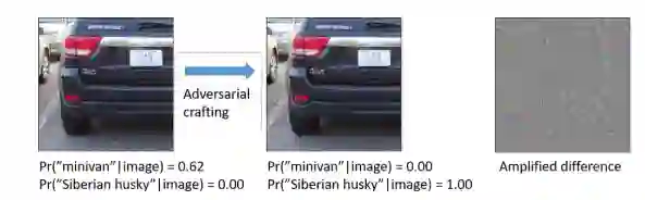 图 1:从小型货车到西伯利亚雪橇犬。 原始图像和操纵(对抗性制作)图像之间的绝对差异(放大 20 倍)显示在右侧。 对抗性示例(中心)是使用 Kurakin 的基本迭代方法(BIM)生成的。