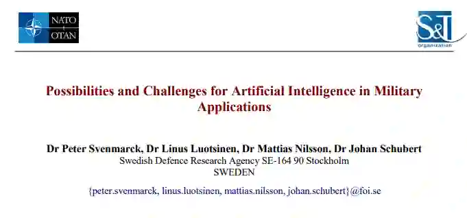 人工智能最近的突破正在逐渐达到可以用于军事应用的地步。 该论文描述了在监视、水下鱼雷战和网络安全中使用人工智能的一些可能性。 其他潜在应用包括使用半自动驾驶车辆和传感器系统进行侦察、在具有长时间要求的防空系统中进行威胁评估、新兴模式的情报分析、指挥和控制系统以及教育和培训。 然而,人工智能的军事应用需要考虑以下方面的挑战: