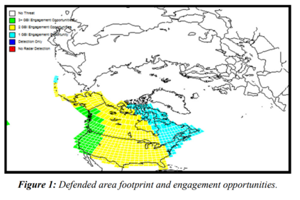 为了帮助关注这个问题,我们定义了一个由五个异质再入飞行器(RVs)和二十个拦截器组成的例子情景,(Wilkening [3])。这个场景当然不是一个饱和的场景,即RV的数量超过了拦截器的库存,正如(Dou等人,[7])所调查的。由于弹道导弹防御(BMD)的复杂性,有些特点和方法我们无法在本报告中涉及或深入分析。与其他研究相比,我们的视角是单面的(仅是防御),而不是双面的(防御和进攻,Brown等人,[8];两阶段博弈,Hausken和Zhuang[9])。我们的研究也主要限于地基拦截器(GBI),而不是其他发射平台,如闲逛的飞机(Burk等人,[10])。我们不考虑诱饵(Washburn[11])。我们注意到,BMD也可以使用基于代理的模拟(Garrett等人,[12]和Holland等人,[13]),或使用马尔科夫链(Menq等人,[14])进行建模。Park和Rothrock[15]研究了在导弹防御中框定人类主体的效果。实时威胁评估和武器分配(TEWA)的细节可以用3维稳定的婚姻算法来建模(Naseem等人,[16])。针对一系列RV的防御性武器的最佳组合可以用线性编程来建模(Beare [17])。尽管有这些假设和简化,我们相信我们的方法为理解BMD提供了一个简单的方法,同时也为评估BMDS的有效性提供了一个直接和统一的方法。