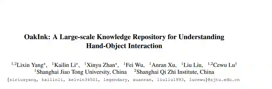 OakInk: A Large-scale Knowledge Repository for Understanding Hand-Object Interaction 作者:杨理欣,李恺林,詹欣宇, 吴非, 徐安然, 刘浏, 卢策吾