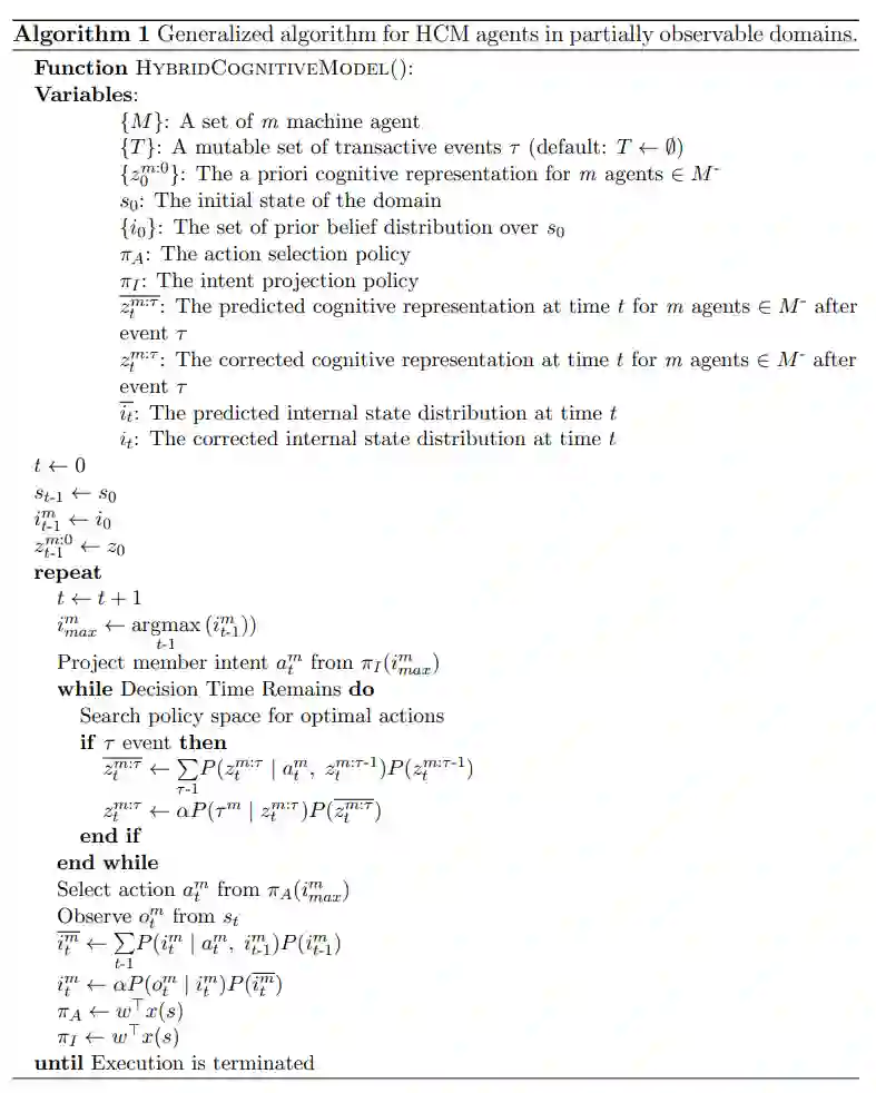 人类与智能体之间的互动无处不在,并渗透到有组织的团体和活动的概念边界中。高绩效的人类团队通过实现共享认知的新兴状态来超越复杂领域的不确定性,在这种状态下,知识被组织、呈现并分配给团队成员,以便快速执行。然而,这需要个人发出可感知的特质,其他成员才能据此推断出意图。为了开展未来的人类和机器团队研究,本研究为完全合作和半合作行动与项目团队中的机器智能体提出了一种混合认知模型。混合认知模型统一了共享心智模型和交互式记忆系统的特点。由此产生的模型便于随时在两种认知表征中进行选择,而计算复杂度仅为单一模型的一半。对混合认知模型的评估是在复杂程度和合作水平不断提高的多智能体领域进行的。智能体的性能根据四个认知特征进行评估,这四个特征捕捉了项目和行动团队中认知的性质和形式。研究采用混合方法对四个既定特征和衡量标准进行分析。结果表明,使用认知模型的智能体形成了编码结构、感知和解释认知形式的一致表征。此外,研究结果表明,采用混合认知模型的智能体可以在必要时在涌现的构成性和汇编性之间切换,以整合行为或知识。