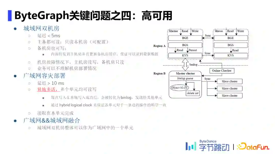 广域网容灾部署,如新加坡和美国的两台机器,延迟较高。follow了mysql的思想,每次写入在本地写入成功后,会被转化为binlog,再发送给其他单元;并通过hybrid logical clock保证各单元对于一条边的操作顺序一致性。