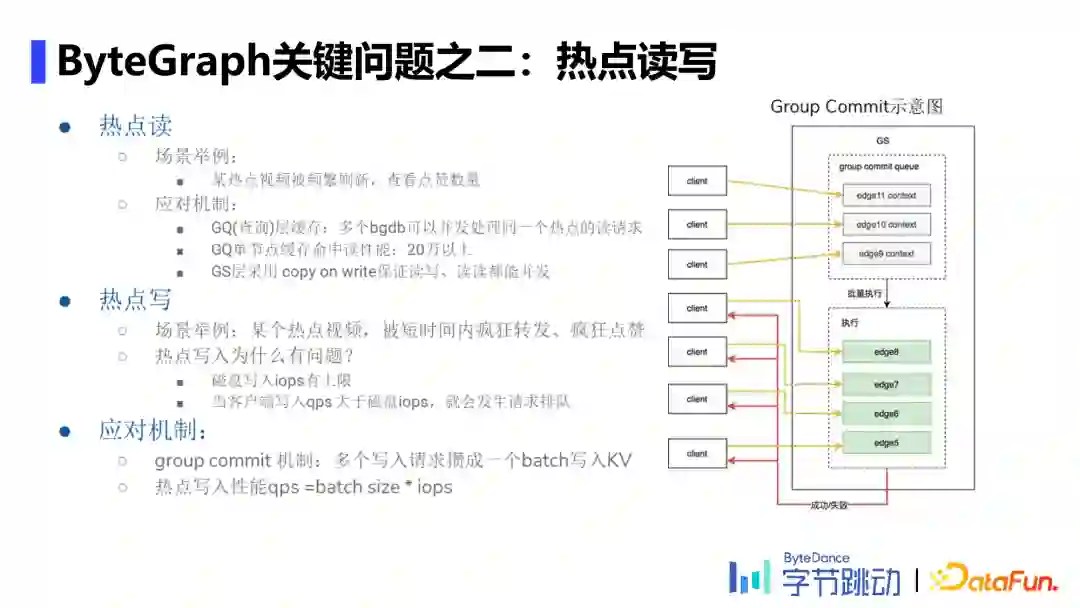 场景举例:某热点视频短时间内被疯狂转发、点赞。 问题溯源:单机cpu使用率被拉高,磁盘写入iops有上限,当客户端写入qps>磁盘iops时,就会发生请求排队。 应对机制:采用group commit机制,即将多个写入请求组合至一个batch写入KV,再批量返回,降低磁盘层iops的上限。