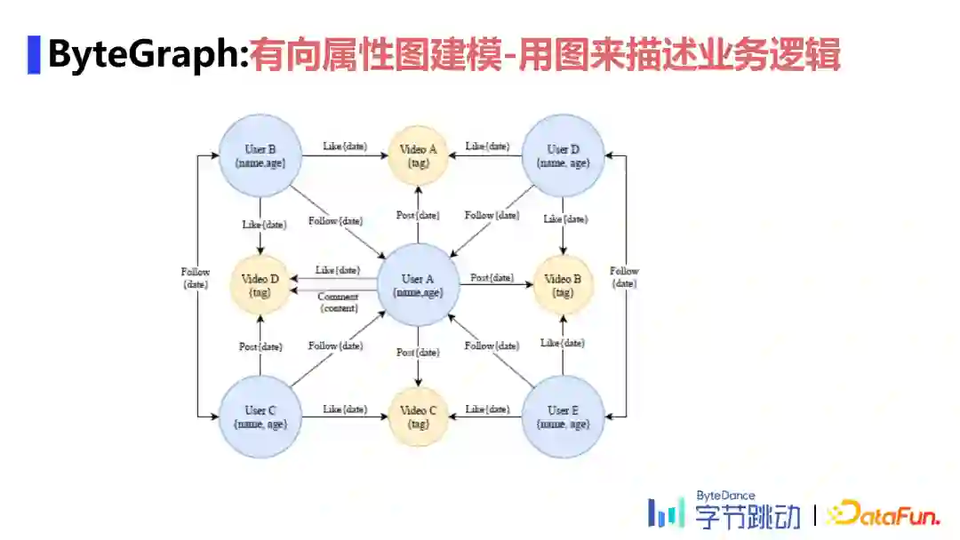 目前来看,图数据库通常有两大类,一种是属性图,另一种是RDF图。属性图在节点和边上有属性表,从某种角度上讲,它仍带有关系数据库的基本特性,类似表结构的形式,实际是采用Key-Value形式来存储的,如用户A关注了用户B,用户C点赞了某个视频等,则会把关注的时间、点赞时间、评论的内容等以不同的有向边存储在属性图中,用图来描述业务逻辑。
