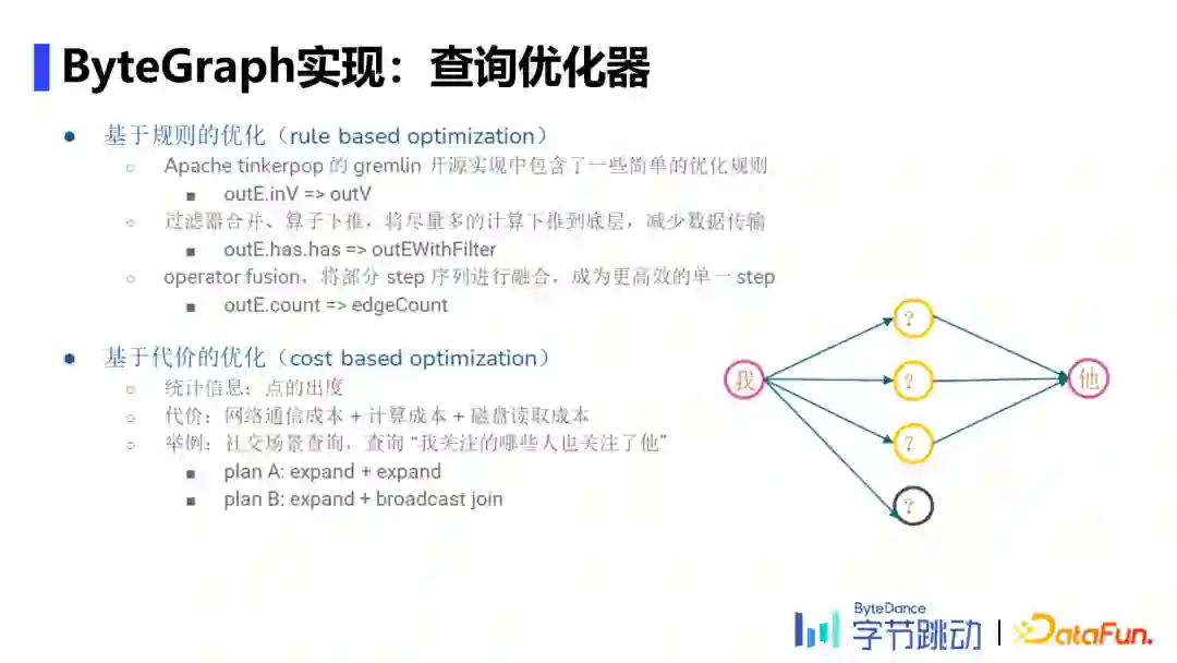 RBO主要基于Gremlin开源实现中的自带优化规则、针对字节应用中的算子下推、自定义的算子优化(fusion)三大规则。CBO本质上是对每个点的出入度做统计,把代价用方程量化表示。