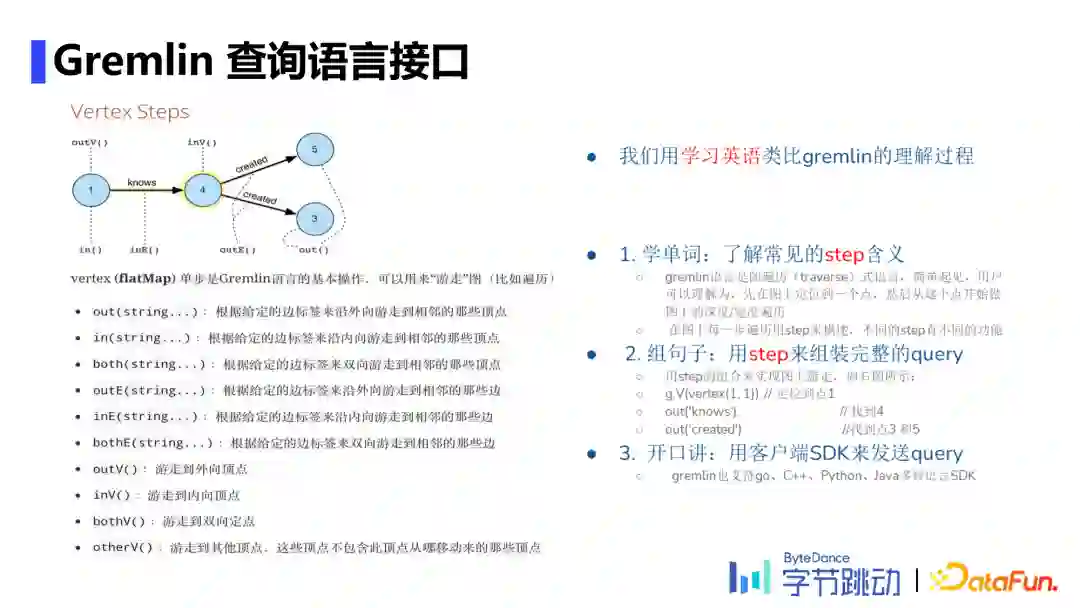 选用Gremlin语言是考虑到之后方便对图计算、图数据库二者进行融合,本身是图灵完备的图遍历语言,相较于Cypher等类SQL语言,对于善用Python的数据分析师更容易上手。 举例:写一条用户A所有一跳好友中满足粉丝数量大于100的子集。首先定位用户A在图中的点,其次求一跳查询中的所有邻居,判断入度邻居整体数量是否大于100,拉取满足条件的所有用户。