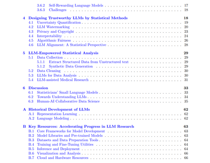 本文的组织结构如下。第2节提供了LLMs基础的背景知识。第3节深入探讨了LLMs的训练流程,包括预训练、提示、微调和对齐技术。第4节重点介绍了利用统计见解设计可信赖的LLMs,涵盖可解释性、不确定性量化、水印、隐私和算法公平性等主题。第5节探讨了LLMs赋能统计分析的潜力,应用于医学研究。最后,第6节总结了统计学家在LLM领域中的作用,强调了合作的重要性,并提出了未来研究方向的建议。附录中提供了额外的资源,包括模型开发框架、库、数据集、训练工具和可视化实用程序,这些资源可以加速LLM研究的进展。