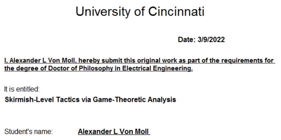 武装冲突中的优势不仅来自于能力或数量上的优势,还来自于资产的使用方式,小到单个车辆和弹药的操作。本文件概述了一项研究计划,重点是针对军事相关场景的小规模战术。小规模交战指的是交战双方的规模--一般是一个对一个、两个对一个和/或一个对两个--以及每个小组的目标或目的都已明确这一事实。问题领域包括追击-规避和目标守卫,其中任何一个都可视为空对空作战、地面资产压制/防御等军事任务中的子问题。在大多数情况下,所考虑的战术包括智能体的控制策略(即其空间机动),但也可能包括角色分配(例如,是充当诱饵还是前锋)以及离散决策(例如,是交战还是撤退)。小规模冲突的战术非常重要,因为它们可以帮助我们了解如何处理更大规模的冲突(多对多、多目标、多决策)。强化学习和神经网络等机器学习方法已被证明能够为大型智能体团队开发控制器。然而,与最优(或均衡)策略相比,这些控制器的性能通常是未知的。微分博弈论以鞍点平衡控制策略和零和博弈中的最小(或最大)成本/回报的形式,为相关情景提供了严格的解决方案。当平衡控制策略可以通过分析获得时,它们就适合机载/实时实施。本文探讨了与经典微分博弈论方法相关的一些挑战。出现这些挑战的主要原因是奇异性的存在,即使是最简单的微分博弈也可能出现奇异性。在** (i) 多追兵、单逃兵微分博弈、(ii) 多智能体炮塔防御场景和 (iii) 交战或撤退场景**中,演示了小规模解决方案的实用性。最终,这项研究成果为新型场景提供了微分博弈和最优控制解决方案、计算奇异曲面的数值技术、计算密集型解决方案的近似值,以及处理具有多个阶段或结果的场景的技术。