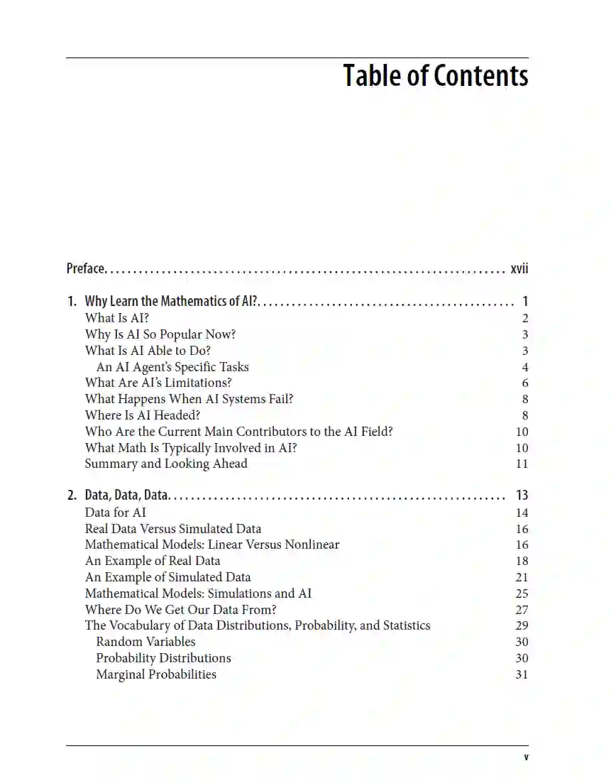 工程师、数据科学家和学生都将通过计算机视觉、自然语言处理和自动化系统等流行应用,研究对人工智能至关重要的数学主题,包括回归、神经网络、优化、反向传播、卷积、马尔可夫链等。补充的Jupyter笔记本提供了Python代码和可视化的示例。无论你是刚刚开始你的职业生涯,还是已经有多年的经验,这本书都为你提供了深入研究该领域所必需的基础。