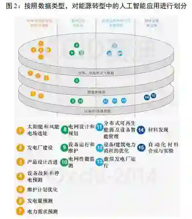 人工智能是一款能够应对全球能源转型复杂性、提高系统效率,从而降低成本、加快转型速度的强大工具,主要应用于四个重点领域:可再生能源发电能力和需求预测、电网运行和优化、能源需求管理以及材料发现和创新。根据德国能源署在2020年 对人工智能在能源行业应用领域的分析(见图2),人工智能应用根据使用的数据资料可分为以下几类:市场、商品和气象数据, 图像和视频,设备和传感器数据。以下各节将对这些应用详细说 明。