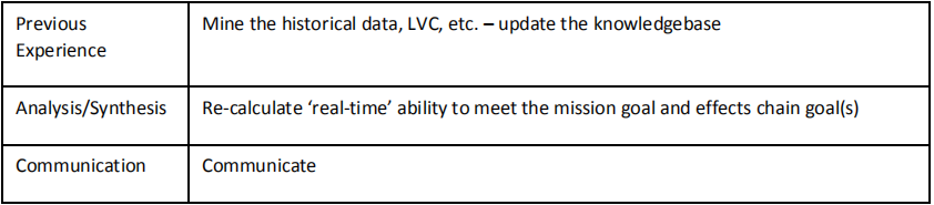 最后两个定向子功能减少了不确定性,并能做出更好的决定和知情行动[Boyd, 1976]。第六个子功能,通信,被添加到明确地解决整个SoS的信息传递。通信子功能不仅仅是拥有通信的手段(如管道);它包括管道上流动的内容(语法和语义、质量、可信度、及时性)以及由管道(边)连接的两个系统(节点)的独特需求。因此,通信是间隙空间的一部分,是任务中每个系统/子系统之间的基础性特征。从博伊德战斗机飞行员角度到SoS任务角度的映射见表2。