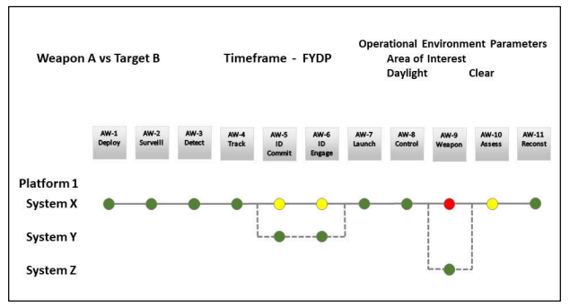 这个过程开始时是基于语言的分析,收集任务信息。这些数据是从理论和政策中检索出来的,包括定义背景和行动任务环境的初始任务线程。该过程的下一步是对任务线程进行事件分解,以创建一系列离散的、按顺序排列的效应/杀伤链(本文中称之为事件链),这些事件链由一组任务组成(例如,跟踪威胁、探测敌意、消除威胁)。事件链被表示为图中的路径,路径中的每个节点/系统根据定义的成功标准被主观地排列为红/黄/绿。在这个分析中,边只被隐含地处理。随着分析的进行,战术系统取代了链上的概念节点。效应/杀伤链随后被重新配置,以最大限度地提高绿色能力。在这些分析的基础上,任务线程被重新配置,并随着目标的发展重复分析。背景和环境充其量是隐含的,而且没有创建支持元数据的任务图。本指南使用一个简单的空战例子来展示这个过程。这个例子的评分标准见表1,评分的事件链,使用节点、边、路径(n,e,p),在图1中显示为一个字符串图。