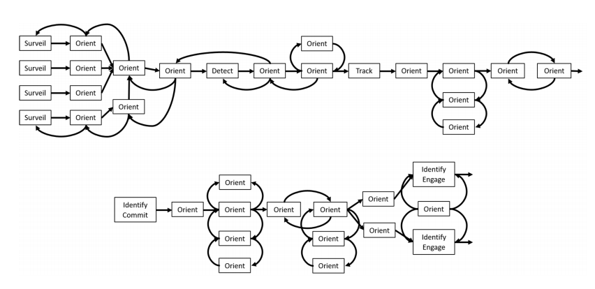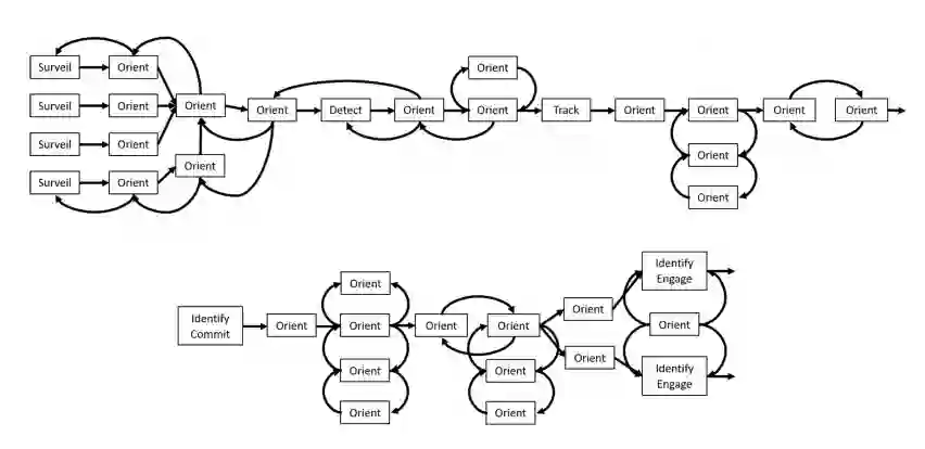 在图1的空战例子中,信息技术(例如,通信、信息技术、数据分析、人工智能)在图中被表示为边。这些边是关于整个任务的集成和互操作性的领域[Garrett, 2011]。因此,边在任务成功中起着主导作用,需要在事件链中明确表示。解决中间环节的过程是基于John Boyd的OODA环路,如图2所示[Boyd, 1987]。