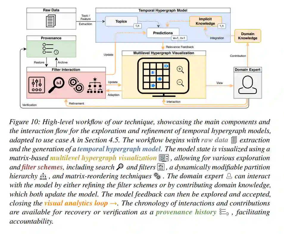 **关联对象的想法使我们通常假设关系是成对的,这就是我们在机器中通常表示关系的方式,即使用图。**图是一种数据结构,描述了一组对象(以节点表示)和它们的成对关系(以边表示)。例如,两个个体之间的简单金融交易可以表示为代表这些个体的两个节点之间的边。图已经成为最普遍的数据结构,用于表示关系并使用它们来发现数据集合中的相关信息。这是因为它们能够将节点级别的信息与底层的节点间关系结合起来。然而,在现实世界中,仅使用成对关系进行推理通常是不够的。考虑一个简单的视觉场景,“一个由椅子、桌子、人和人体解剖图组成的房间”。在这种情况下,利用人-椅子或人-办公桌之间的成对关系准确地对人做出哪怕是简单的推断都是不太可能的。但是,如果我们把所有对象都纳入其中,分析人-椅-桌与人体解剖图的群体关系,就可以对人是医生,房间是诊所做出公正的判断。这些群体关系被称为高阶关系——一次涉及两个以上的对象——对人类获得洞见至关重要。高阶关系在许多领域都很常见,例如医学(例如疾病/症状共存)、药理学(例如化学反应)、文献计量学(例如合作研究人员)、人员分析(例如一个团队)和社交网络(例如用户群和其中的帖子)。这些关系捕获了一组对象,其中每个对象可以表现出不同的属性,并且高阶关系可以随时间动态变化。因此,使用图将现实世界数据集中的关系表示为成对连接,在捕捉复杂信息方面不是最优的。使用高阶关系可以增强数据结构的表示能力。
