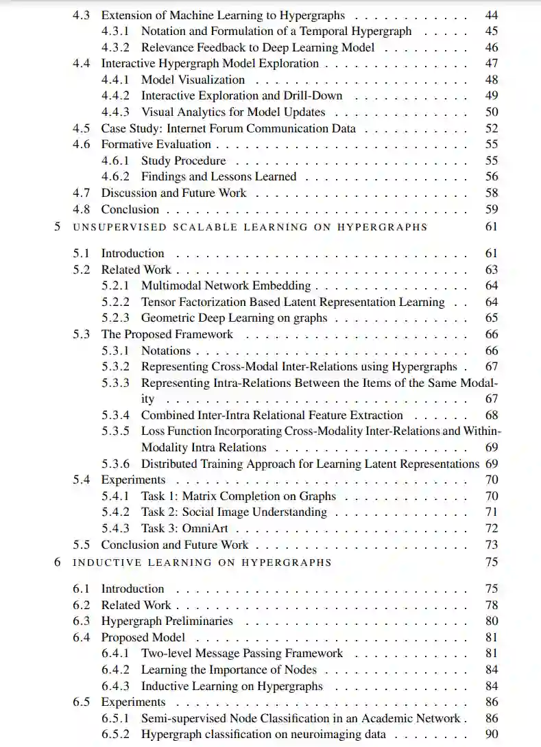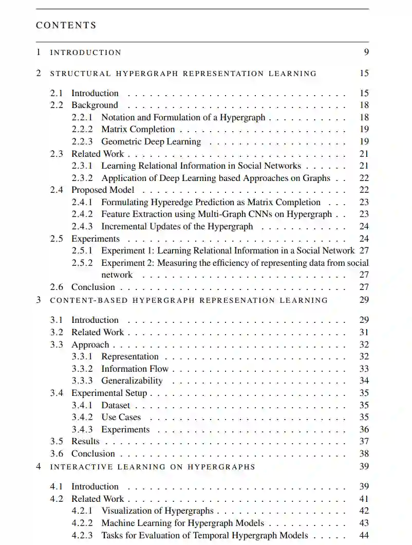 **就像人类利用高阶关系来理解世界一样,机器也应该能够利用它们进行更好的推理。然而,如上所述,用图来建模高阶关系会导致信息丢失。**这种成对关系不能表示对象之间所有的高阶关系,也不能正确地捕捉信息的集体流动。使用超图可以更好地表示相交的高阶关系集合。超图是一种类似图的结构,它允许边(称为“超边”或“超链接”)跨越两个以上的节点。在超图中存在两种关系:超边内节点间的组内关系和超边上节点间的组间关系。为了更好地理解、学习和推断这种关系,本文提出了超图表示学习的新方法。介绍了一系列用于在超图上构造基于深度神经网络模型的表示和计算的方法。所提出的超图表示最终允许从由复杂高阶关系组成的多模态数据中学习改进泛化。本文对超图上的表示学习进行了广泛的研究。试图同时了解存储在节点上作为特征的对象的内容,以及用超边表示的对象之间的高阶关系。重点是开发超图学习框架,可以捕捉动态演变的真实世界数据集上的群体关系。