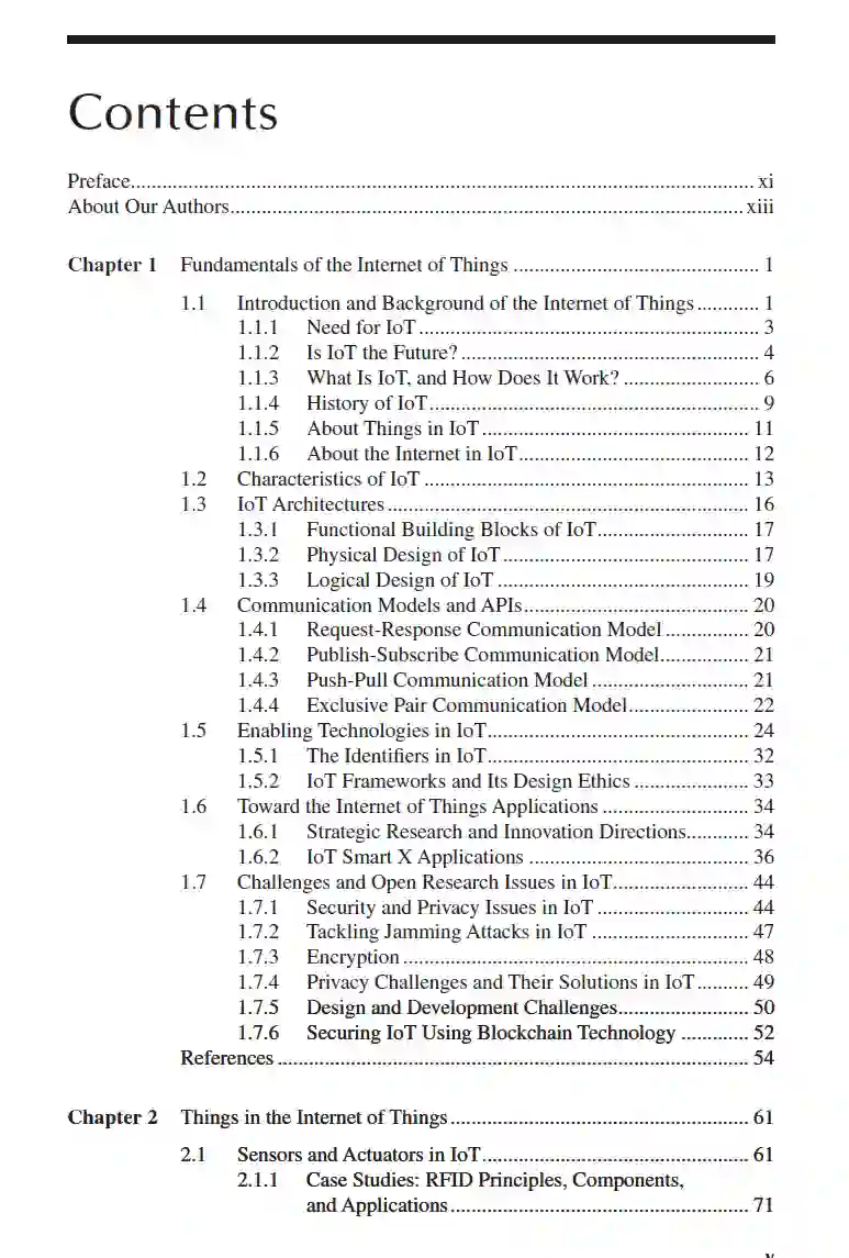 这本书讨论了物联网(IoT)的基础技术、架构、应用领域以及未来研究方向。它还讨论了如何根据应用需求创建自己的IoT系统,并提供了IoT领域最新趋势和开放研究问题的更广阔视角。本书涵盖了无线网络、高级信号处理、IoT和普适计算等多个研究领域。《物联网:理论到实践》讨论了IoT的基础知识和基本原理,以及实时应用和相关挑战与开放研究问题。书中包括了几个关于IoT在日常生活中应用的案例研究。作者回顾了各种高级计算技术——如云计算、雾计算、边缘计算和大数据分析——这些技术在未来基于IoT的服务中将发挥关键作用。书中详细介绍了区块链技术、窄带物联网(NB-IoT)、无线身体区域网络(WBAN)、LoRa(一种长距离低功耗平台)和工业物联网(IIoT)在5G世界中的作用。本书面向大学/学院学生,以及业余电子爱好者和希望在IoT领域保持最新的行业专业人士。