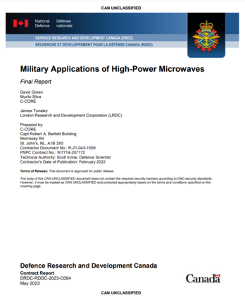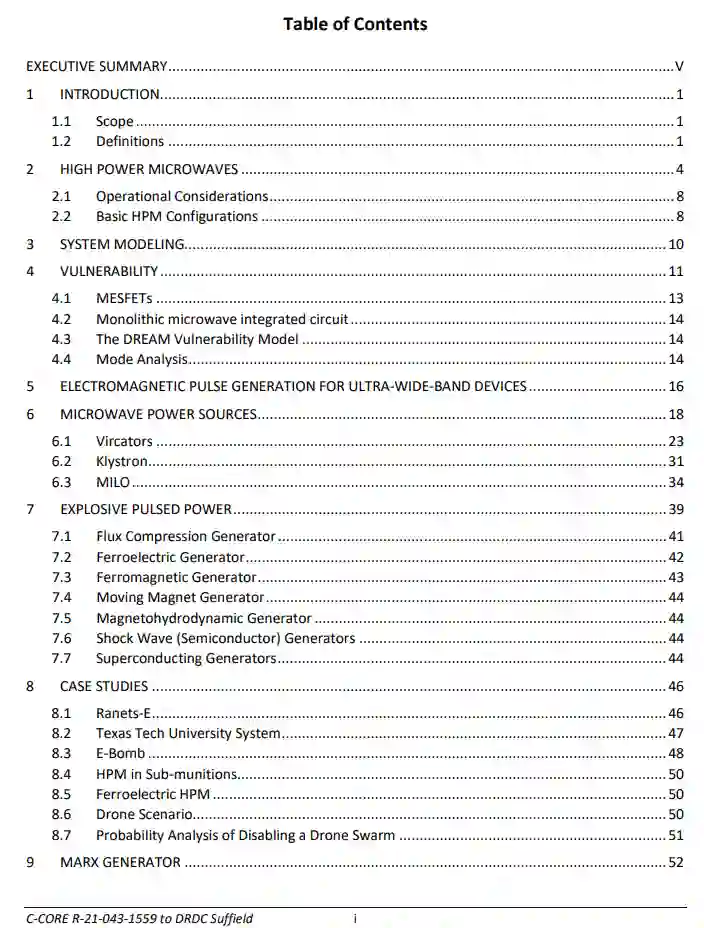 伦敦研究与发展公司(LRDC)和C-CORE对高功率微波(HPM)设备进行了初步、广泛的文献调查,包括案例研究和建模技术。高功率微波可使军事行动中使用的电子设备失效或毁坏。调查结果总结如下。