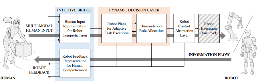 经解码的信息馈入自适应任务规划层,机器人据此构建所学技能结构,并基于上下文相关性、任务约束与用户状态持续调整策略。此时系统作为“动态决策者”运行,优先处理信息量最大的输入。角色分配由此过程自然涌现:系统依据人机输入的信息含量与可靠性,动态判定任一时刻应由谁主导或辅助,从而优化流程顺畅度与效率。角色确定后,机器人控制抽象层衔接高层决策(如任务规划与角色分配)与机器人实时执行能力,并通过其底层控制器付诸实施。