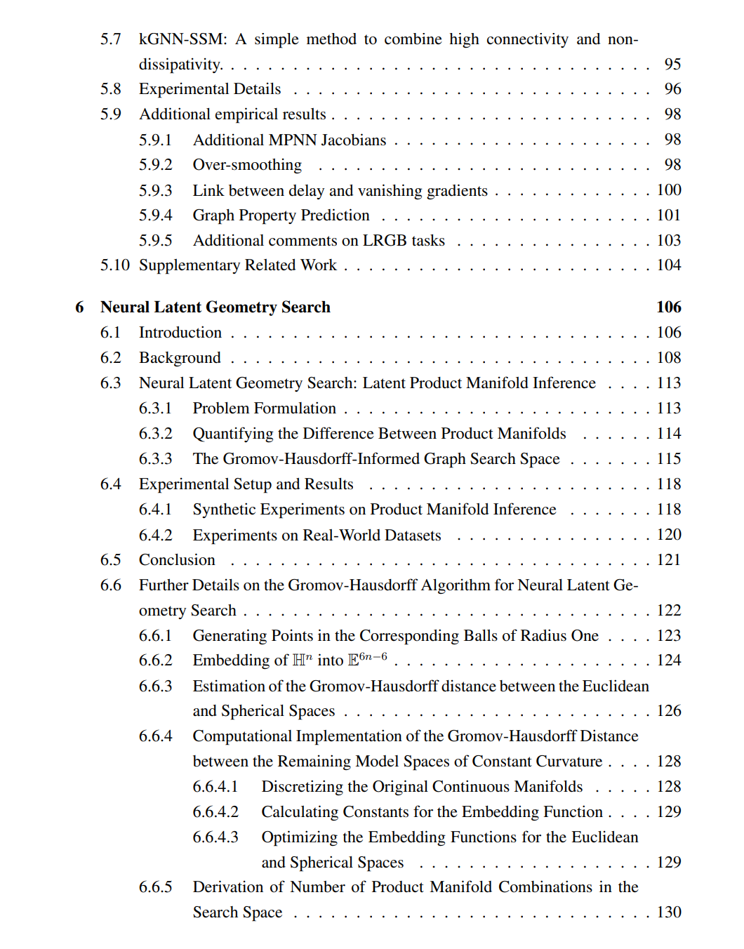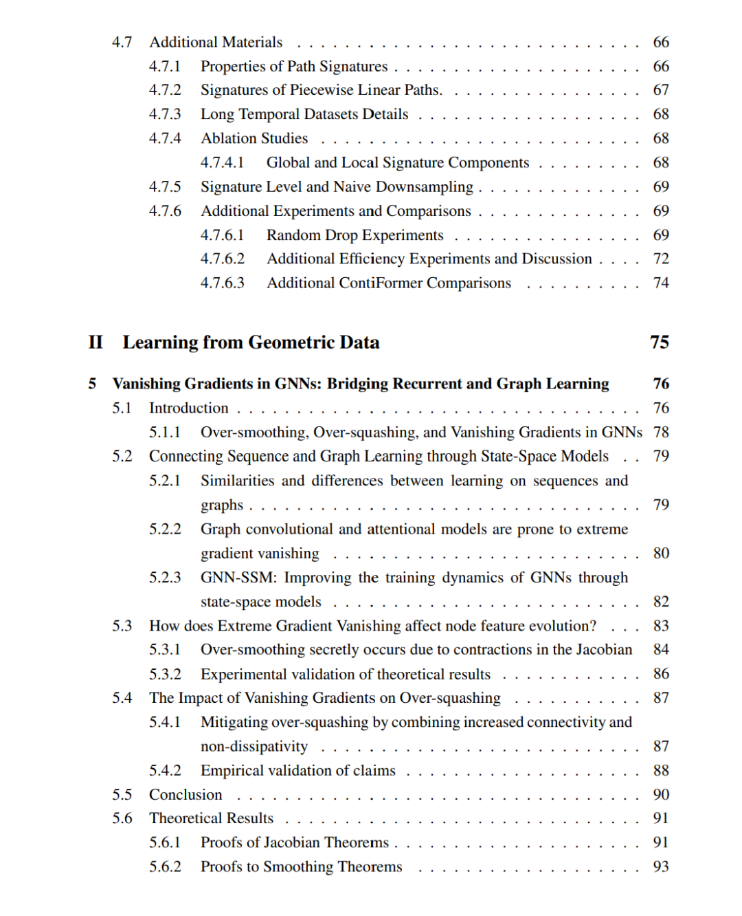 我们将本论文划分为两个部分。第一部分关注学习具备序列结构的数据,并解决深度学习在该数据模态中面临的若干经典问题。第二部分聚焦于几何深度学习,在第 §5 节中,我们构建了递归模型与图深度学习之间的联系,并进一步研究了流形学习中的一个独立问题。 首先,在 §3 中,我们提出了一种用于限制订单簿(limit order books)的深度生存分析方法,该方法利用卷积–Transformer 生成潜在表示,并使用单调神经网络来满足所建模函数的约束。通过将局部卷积滤波器、自注意力机制以及右删失对数似然损失相结合,我们的方法能够有效捕捉高频金融数据中复杂的时间动态,在订单成交概率的估计上显著优于标准基线方法。 接着在 §4 中,我们介绍了 Rough Transformers ——一种将 signature transforms 融入 Transformer 的新架构。通过提取局部与全局的 signature 特征,Rough Transformer 能够高效建模不规则采样的时间序列数据,同时大幅降低计算成本。 在图神经网络方面,我们在 §5 中重新审视过平滑与过压缩现象,并从消失梯度(vanishing gradients)的角度分析其根源。我们展示了归一化邻接矩阵的收缩特性如何导致梯度骤减及表示坍缩。通过将 GNN 重新解释为状态空间模型(state-space models),我们提出了 GNN-SSMs,该模型能够显式控制逐层雅可比矩阵谱。该状态空间化框架能够缓解过平滑问题,并增强长程信息传播,有效连接递归学习与图学习的思想。 最后,在 §6 中,我们提出 Neural Latent Geometry Search(NLGS),一个能够自动发现最优潜在空间几何结构的框架。我们将潜在空间建模为常曲率流形的笛卡尔积,并引入一种基于 Gromov–Hausdorff 距离的原则性度量来比较候选潜在几何。通过构建一个融入几何信息的图搜索空间并应用贝叶斯优化,我们的方法能够高效发现与数据内在结构最契合的“乘积流形签名”,并在图像重建与潜在图结构推断等任务上验证了其有效性。 总体而言,这些研究贡献旨在通过将时间与几何归纳偏置融入深度神经网络架构,推动深度学习在表达能力、可扩展性与性能方面的提升,以更好地服务多样化的真实应用场景。
