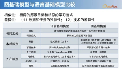 图模型也不具备大模型的能力。图模型表达能力有限,还存在过平滑、过压缩的问题,无法做成深层模型,并且也不具备涌现能力、难以支持多任务。 9. 图基础模型大模型和图模型无法解决彼此的问题,因此提出了图基础模型。图基础模型(Graph Foundation Model 简称 GFM)是一个在广泛的图数据上预训练的模型,适用于不同的下游图任务。