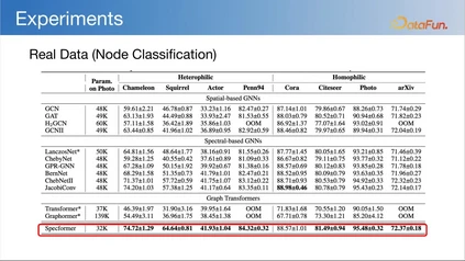 我们还验证了其知识迁移能力,即在一个领域做训练,在另一个领域做预测。从上图中可以看到,计算机与材料、工程、化学的相关性是比较强的,但与艺术领域的关联性是很弱的,是负关联。通过知识迁移实验发现,结构相关的情况下知识迁移会表现较好。结构越相关,知识迁移能力的提升越明显。这也说明了结构知识的迁移是一件很困难的事情。2. Specformer (ICLR 2023)