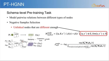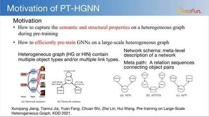 PT-HGNN 的动机在于如何对异质图进行预训练,以保留其结构和语义特性,用于对大规模图数据的处理。异质图是包含不同类型节点和边的图结构,能够更精准地刻画复杂交互系统。网络模式(network schema)是对图中节点间交互模式的一种描述。元路径(meta path)是指连接两个节点的关系序列,揭示了节点间是通过何种路径在图中进行连接的。在异质图领域,我们已开展了大量工作,并在工业界取得了良好的应用效果。如果对这部分内容感兴趣,可以查阅相关材料。