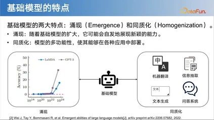 基础模型具备两大鲜明特点:涌现与同质化。首先,涌现是指随着基础模型规模的扩大,参数量不断增加,模型的能力有可能出现质的飞跃,自发地展现出一些新颖的功能。这种能力的突变使得模型在处理任务时更加高效和灵活。其次,同质化则体现在模型的多功能性上。基础模型能够广泛部署于各种应用场景中,一个模型就能解决多种问题。尤其在语言模型领域,这种同质化特点表现得尤为突出。过去,自然语言处理领域需要针对二三十种甚至更多的不同任务设计相应的模型,而现在,一个大语言模型就能轻松应对翻译、抽取、生成、问答等各种任务。这种变化是机器学习领域前所未有的,也充分展示了基础模型同质化的强大优势。****