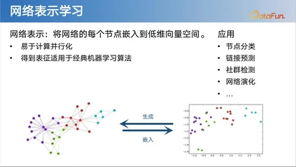 网络表示学习是一个重要的研究方向。其核心思想是将网络中的每个节点嵌入到低维的向量空间中,从而实现对节点特征的降维。过去,我们通常使用关联矩阵来表示网络中节点的关系,但这种表示方法往往会产生高维且稀疏的向量,不利于后续的处理和分析。而现在,通过低维向量的表示,我们可以更有效地捕捉节点的内在特征,并且这种表示方式更易于进行并行化处理。学习得到的节点表示具有广泛的应用价值。它们可以被直接用于各种经典的机器学习问题,如节点分类、链接预测和社群发现等。通过使用这些低维特征表示,我们可以更加高效和准确地进行这些任务的处理,从而推动图机器学习在实际应用中的进一步发展****