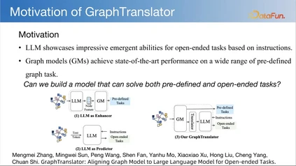 下面介绍的 GraphTranslator 属于图基础模型三种技术中的第三类,即图模型与大语言模型相结合。这一工作的动机为: