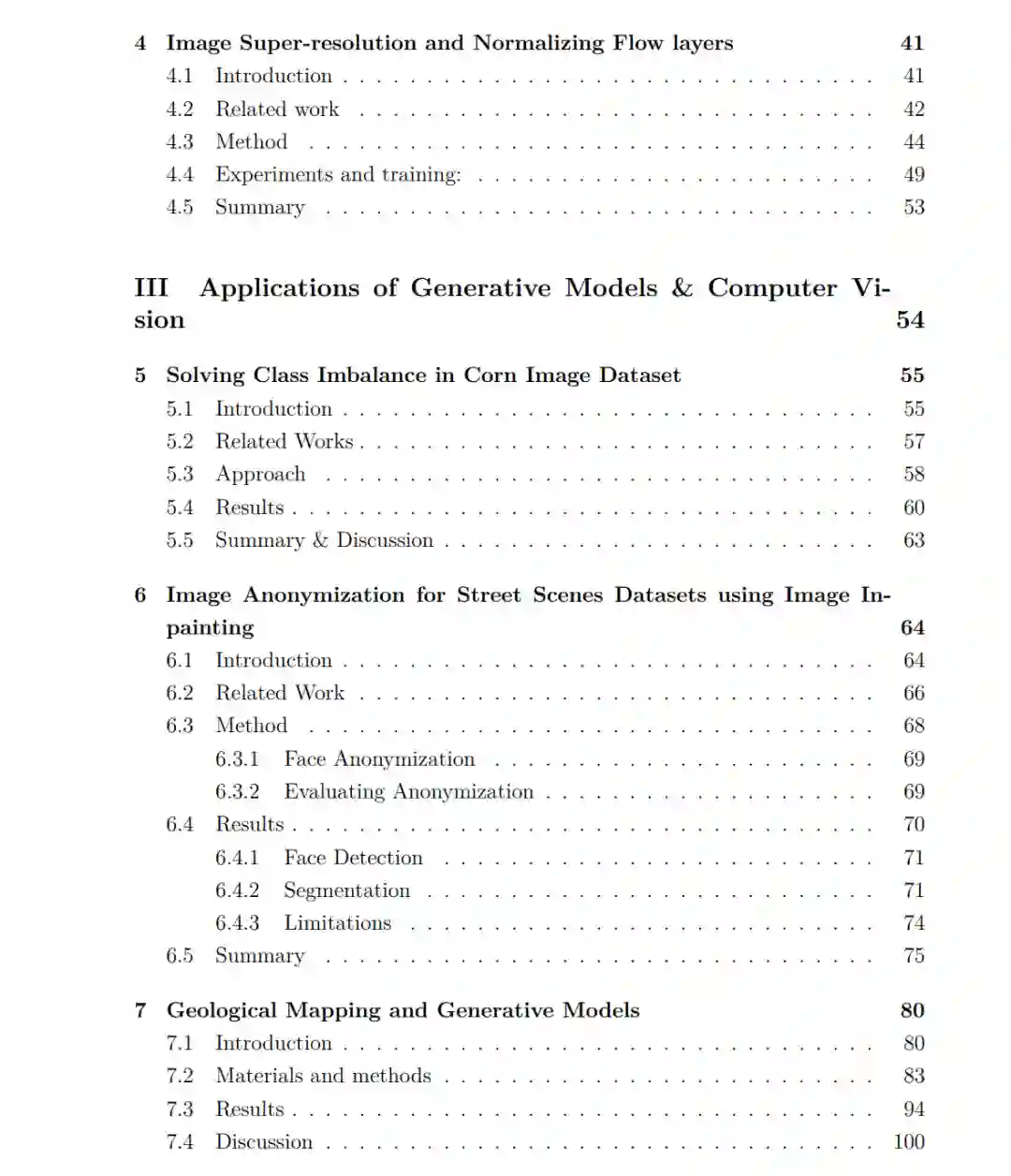 本论文在两个主要方向上作出了创新贡献:一是提升生成模型(尤其是归一化流)的效率,二是将生成模型应用于解决真实世界的计算机视觉问题。第一部分中,我们通过六个关键创新,对归一化流结构进行了重要改进:(1)构建了可逆的 3×3 卷积层,并从数学上给出了可逆性的充要条件;(2)提出了一种更高效的四路耦合(Quad-coupling)层;(3)设计了针对 k×k 卷积层的快速高效并行反演算法;(4)提出了用于卷积逆运算的快速高效反向传播算法;(5)在 Inverse-Flow 中于正向传播阶段使用卷积的逆运算,并采用所提出的反向传播算法进行训练;(6)提出 AffineStableSR,这是一种紧凑高效的超分辨率模型,利用预训练权重与归一化流层,在保持性能的同时显著减少参数量。这些改进在显著提升计算效率的同时,仍然保持了模型的表达能力,相较现有方法具有明显优势。 第二部分展示了生成建模方面的这些进展在多种计算机视觉任务中的实际应用。具体而言,本文工作包括:(1)基于条件 GAN 的农产品自动质量评估系统,用于缓解类别不平衡、数据稀缺与标注困难等问题,并在种子纯度检测任务中取得了较高准确率;(2)一个用于地质制图的无监督框架,利用堆叠自动编码器进行降维,相比传统方法展现出更优的特征提取能力;(3)提出了一种面向自动驾驶数据集的隐私保护方法,基于人脸检测与图像修复(inpainting);(4)进一步利用基于 Stable Diffusion 的图像修复技术,对检测到的人脸和车牌进行替换,从而推动隐私保护技术及其在该领域中的伦理实践;(5)提出了一种用于艺术修复的改进扩散模型,通过统一的微调策略,有效应对多种类型的退化。 本论文在生成模型的理论理解及其实践应用方面均取得了进展,在效率、可扩展性以及多领域的真实应用价值等方面实现了显著提升。 关键词:归一化流,可逆卷积,生成模型,图像生成模型的应用