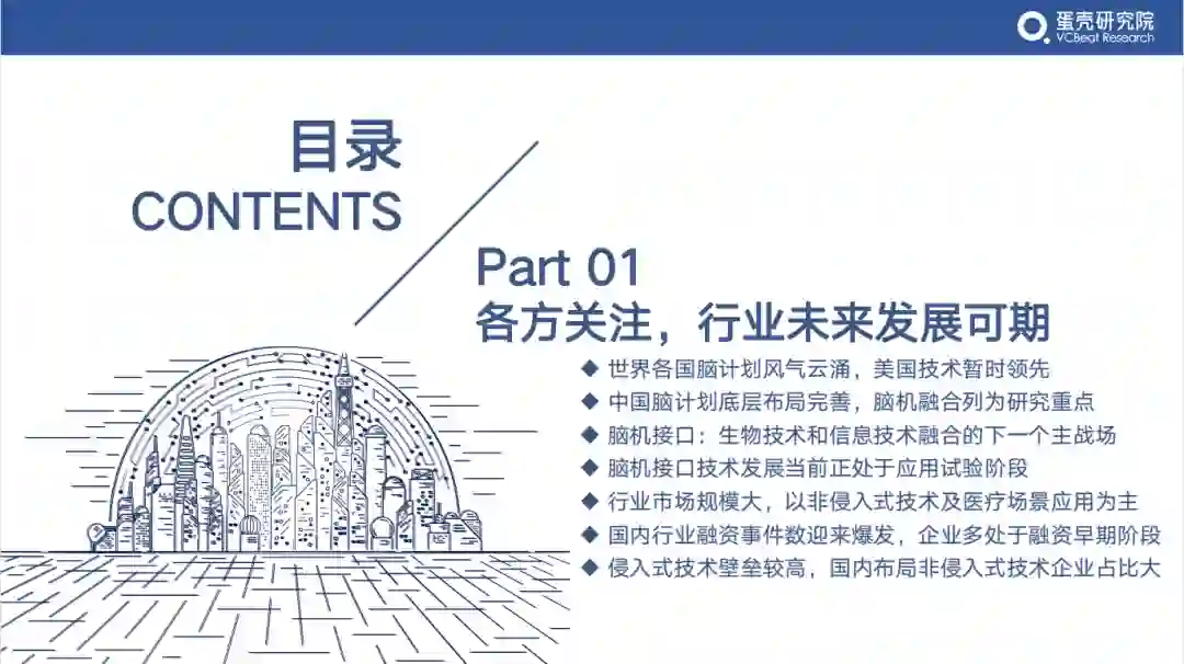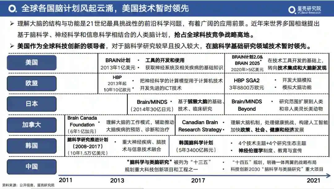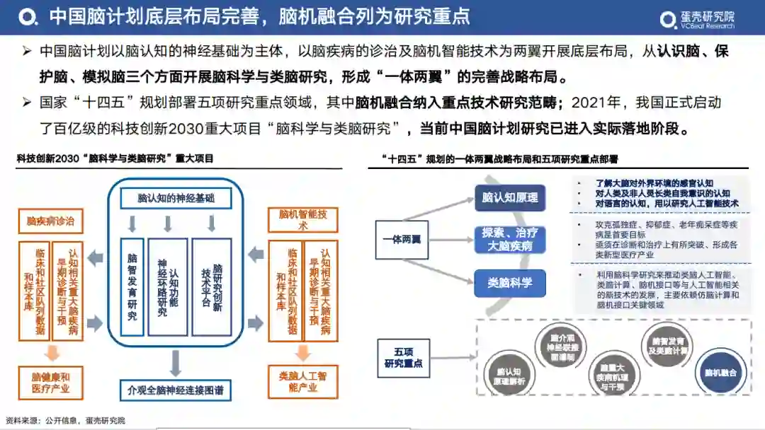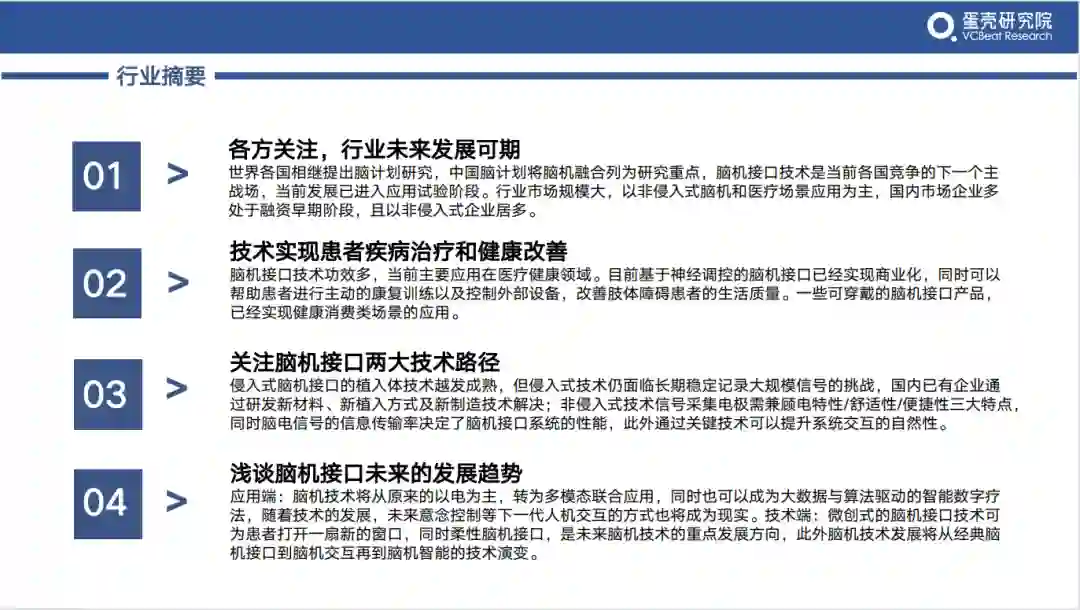 世界各国相继提出脑计划研究,中国脑计划将脑机融合列为研究重点,脑机接口技术是当前各国竞争的下一个主战场,当前发展已进入应用试验阶段。行业市场规模大,以非侵入式脑机和医疗场景应用为主,国内市场企业多处于融资早期阶段,且以非侵入式企业居多。 技术实现患者疾病治疗和健康改善