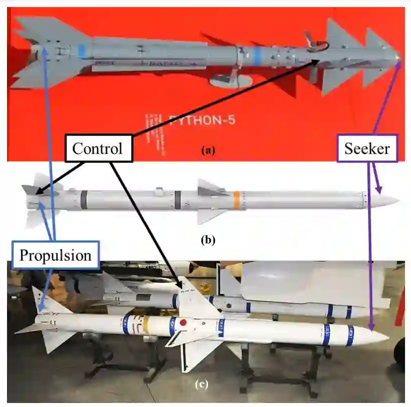 图 1. 空对空导弹上的组件位置: (a) Python 5,(b) 空中拦截导弹 (AIM)-120。,(c) AIM-7。