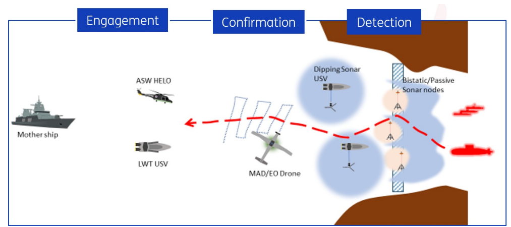 图1. 为监控潜艇通过阻塞点或港口附近而设想的反潜战屏障交战链示意图。