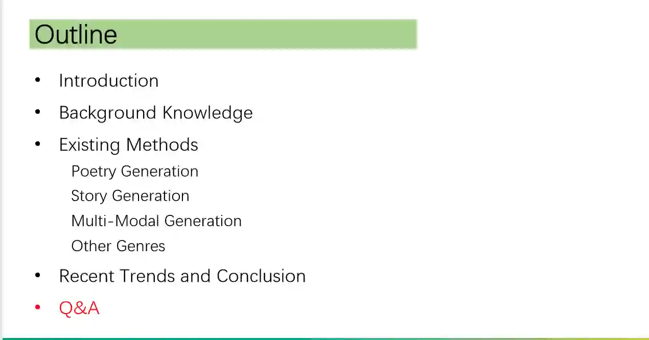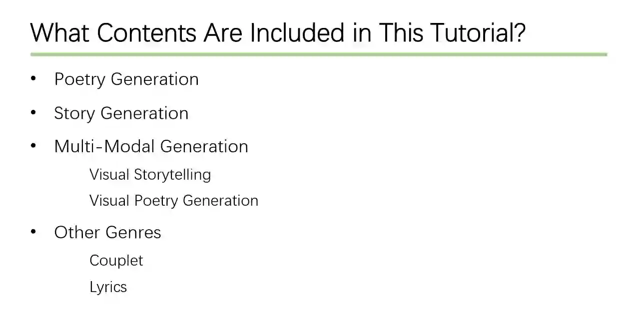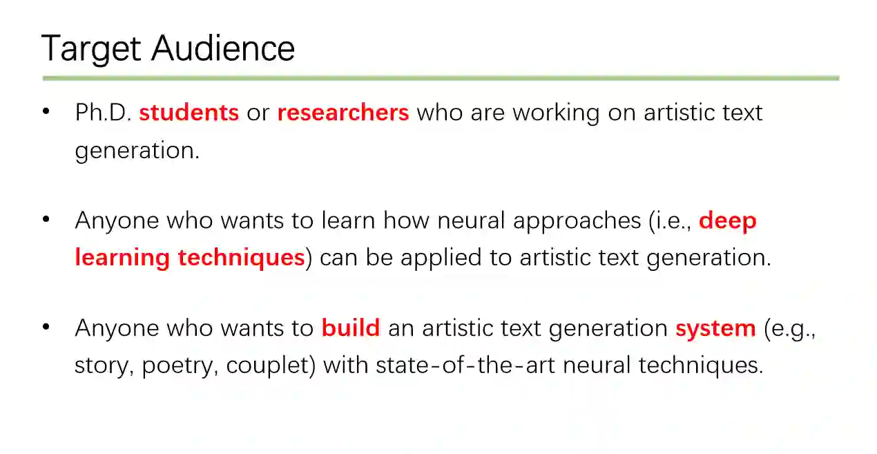 简介: 文本生成和自动书写已逐渐成为人工智能界的前沿之一。 为了促进文本生成的发展,我们在本教程中总结了现有的研究并概述了其技术实现。 具体来说,我们专注于创意和艺术写作的最新进展和趋势,包括故事,诗歌和对联的体裁。