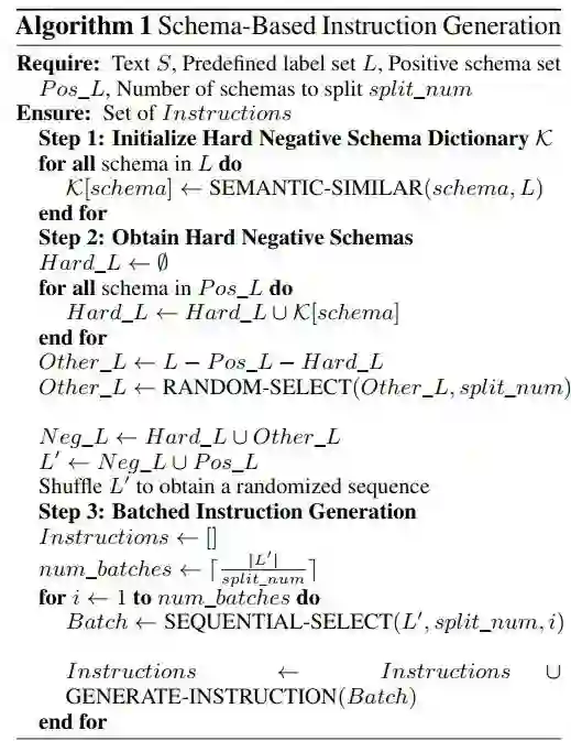 在完成了上述步骤后,我们得到了最终的Schema集合L'=Pos L + Neg L。在指令生成阶段,我们采用轮询式方法,限制每次询问的schema数量为split_num个,取值范围在4至6之间。因此L'将被分为len(L')/split_num个批次进行询问,每批次询问split_num个schema。即使在评估阶段询问的schema数目与训练时不同,通过轮询机制,我们可以将询问数量平均分散至split_num个,从而缓解因训练和评估中使用不同schema query数量导致的泛化性能下降的问题。 算法一展示了上述方法的数学表示