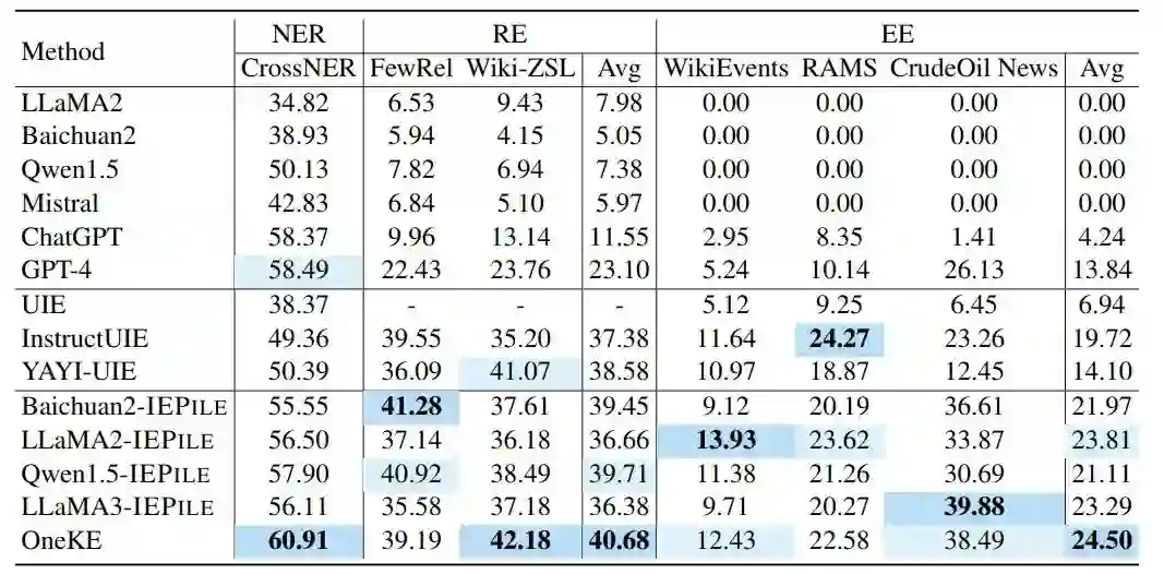 基于IEPile,我们对几个最新的模型进行了微调,然后比较它们与一系列基准模型的零样本泛化能力。 评价指标:我们采用基于跨度的Micro-F1作为衡量模型性能的指标。 基准模型:我们选择了一系列强大的模型进行对比分析,包括UIE 、LLaMA2-13B-Chat、Baichuan2-13B-Chat、Qwen1.5-14B-Chat、Mistral-7B-Instruct-v0.2、ChatGPT 、GPT-4、LLaMA3-8B-Instruct、InstructUIE、YAYI-UIE。 零样本基准:我们收集了13个未在训练集中出现的数据集。 OneKE:此外,我们利用IEPile和其他专有的信息抽取数据集对alpaca2-chinese-13B模型进行了全参数微调。 主要实验