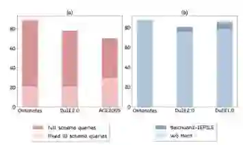 在表1和1中,我们报告了三个任务和两种语言的零样本性能。总体而言,在经过IEPile训练后,模型在大部分任务中都取得了更好的结果。我们认为成功的原因在于难负样本构造和轮询式指令生成策略,这两种策略能够缓解训练-评估不匹配和语义模糊的问题。我们也观察到,在英文NER任务中,IEPile-模型稍微落后于GPT-4。我们推测这种差距可能是由于GPT-4在其训练过程中接触了大量的类似数据。另外,需要注意的是,InstructUIE专注于英文数据,而IEPile同时涵盖了英文和中文数据。这种数据差异可能影响模型在英文方面的表现,从而降低性能。此外,OneKE在几乎所有的零样本评估任务中实现了最佳的结果。我们将其成功归因于全参数微调带来的增强效果。 分析 schema查询数不一致伤害泛化能力 我们研究了在训练和评估中使用不同数量的模式查询对模型性能的影响。我们在Ontonotes(18个schema)、DuIE2.0(49个schema)和ACE2005(33个schema)这三个数据集上用完整schema指令训练Baichuan2。对于评估,我们测试了两种策略:一种使用完整的schema查询集合,另一种使用固定数量的10个schema查询。下图(a)所示的结果表明,评估期间schema查询数量的不一致显著降低了模型的表现。对模型输出的进一步分析揭示出,模型总是倾向于针对每个查询生成输出。我们假设schema查询的数量是影响泛化能力的关键因素之一。模型需要先适应训练中罕见的schema查询数量,然后再适应未见的schema。 schema之间的区分不足导致语义相似混淆 我们还评估了移除“难负schema字典”对Baichuan2-IEPile性能的影响,特别关注难以区别的schema。根据下图(b)的结果,我们注意到难负schema字典在NER任务中的作用相对有限,这可能是由于实体识别固有的清晰边界。然而,使用难负schema字典明显提升了DuIE2.0和DuEE1.0数据集上的模型性能。我们观察到,语义相似且容易混淆的模式经常出现在模型的输出中,例如“离职”事件与“解雇”和“辞职”事件。因此,处理语义易混淆的指令提出了重大挑战,而难负schema字典在增强模型鲁棒性和提高预测准确性方面起着关键作用。