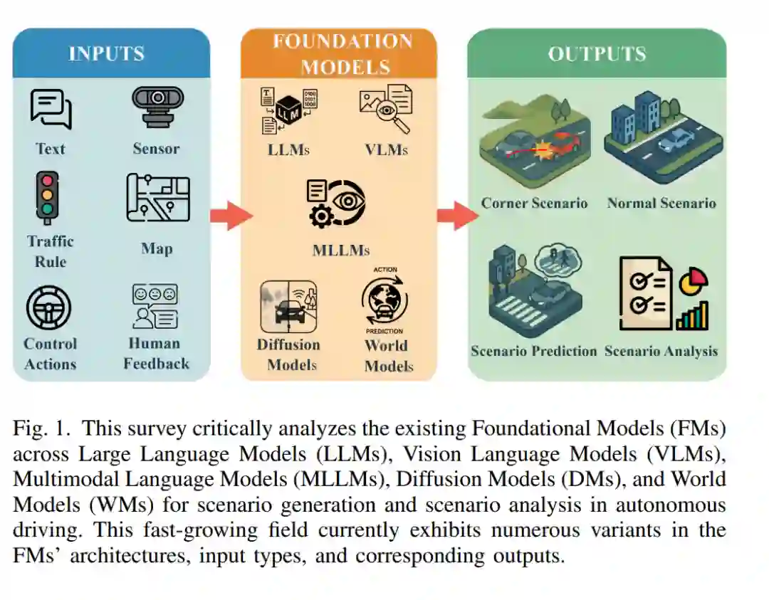 摘要——对于自动驾驶车辆而言,在复杂环境中实现安全导航依赖于其对多样化且罕见的驾驶场景的应对能力。基于仿真与场景的测试已成为自动驾驶系统开发与验证的关键方法。传统的场景生成依赖于基于规则的系统、知识驱动模型和数据驱动的合成方式,但这些方法往往生成的场景多样性有限,且难以覆盖逼真的安全关键情形。随着基础模型(即新一代预训练的通用人工智能模型)的兴起,开发者可以处理异构输入(例如自然语言、传感器数据、高精地图和控制动作),从而实现复杂驾驶场景的合成与理解。 本文针对基础模型在自动驾驶中的场景生成与场景分析应用(截至2025年5月)进行了系统综述。我们提出了一个统一的分类体系,涵盖大语言模型、视觉语言模型、多模态大语言模型、扩散模型和世界模型,用于自动驾驶场景的生成与分析。此外,本文还回顾了相关的方法论、开源数据集、仿真平台与基准挑战,并分析了专门面向场景生成与分析的评估指标。最后,我们总结了当前存在的关键挑战与研究问题,并提出了未来值得探索的研究方向。所有参考论文均收录于持续维护的资料库中,附带补充材料,托管于 GitHub.com/TUM-AVS/FM-for-Scenario-Generation-Analysis。