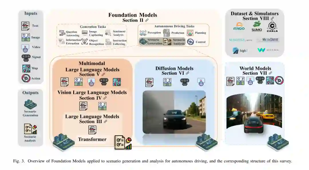 本综述的整体结构如图 3 所示: * 第 II 节介绍基础模型,并对已有关于场景生成与分析的相关综述进行评述,涵盖经典方法与基础模型驱动的最新进展; * 第 III、IV、V 节系统探讨语言类基础模型,从基本概念出发,详细分析大语言模型(LLMs)、视觉语言模型(VLMs)和多模态大语言模型(MLLMs)在场景生成与分析中的应用; * 第 VI 与 VII 节聚焦于视觉为中心的基础模型,分别介绍扩散模型与世界模型的基本原理及其与场景生成的关联; * 第 VIII 节调研当前可公开获取的数据集与仿真基准,重点介绍与自动驾驶场景生成与分析密切相关的竞赛与挑战; * 第 IX 和 X 节归纳当前的研究难点与开放性问题,并展望未来的研究方向; * 第 XI 节总结本综述的核心发现与主要观点。