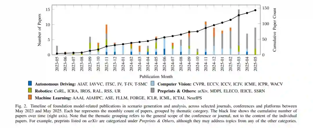 本综述聚焦于基础模型在自动驾驶场景生成与场景分析中的应用(参见图 1)。我们通过在 Google Scholar 中进行关键词检索(完整关键词列表见论文 GitHub 仓库)对相关文献进行筛选。 为了确保综述的广度与相关性,我们纳入了同行评审的会议与期刊论文,以及 arXiv 上的预印本。尽管 arXiv 上的论文未经过正式同行评审,但其在快速发展领域(如基础模型应用)中往往代表前沿且具有影响力的研究。我们调研的时间范围涵盖从 2022 年 10 月至 2025 年 5 月 之间发表的文献,重点关注自动驾驶、计算机视觉、机器学习/人工智能(AI)与机器人领域的研究成果。图 2 展示了按月统计的发表数量及其在不同类型平台(会议、期刊或预印本)中的分布趋势。每篇文献的发表平台及其开源代码(如有)均在论文 GitHub 仓库中列出。