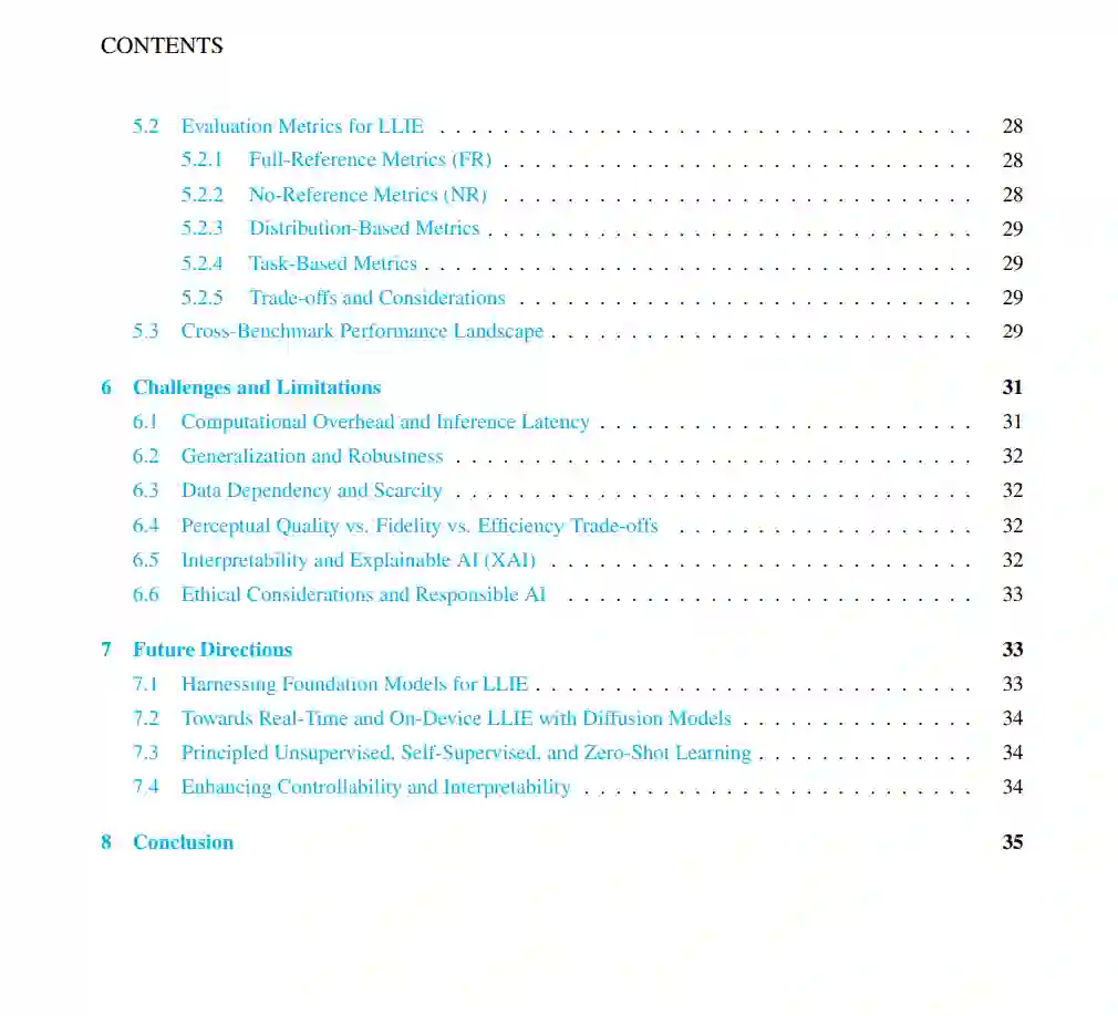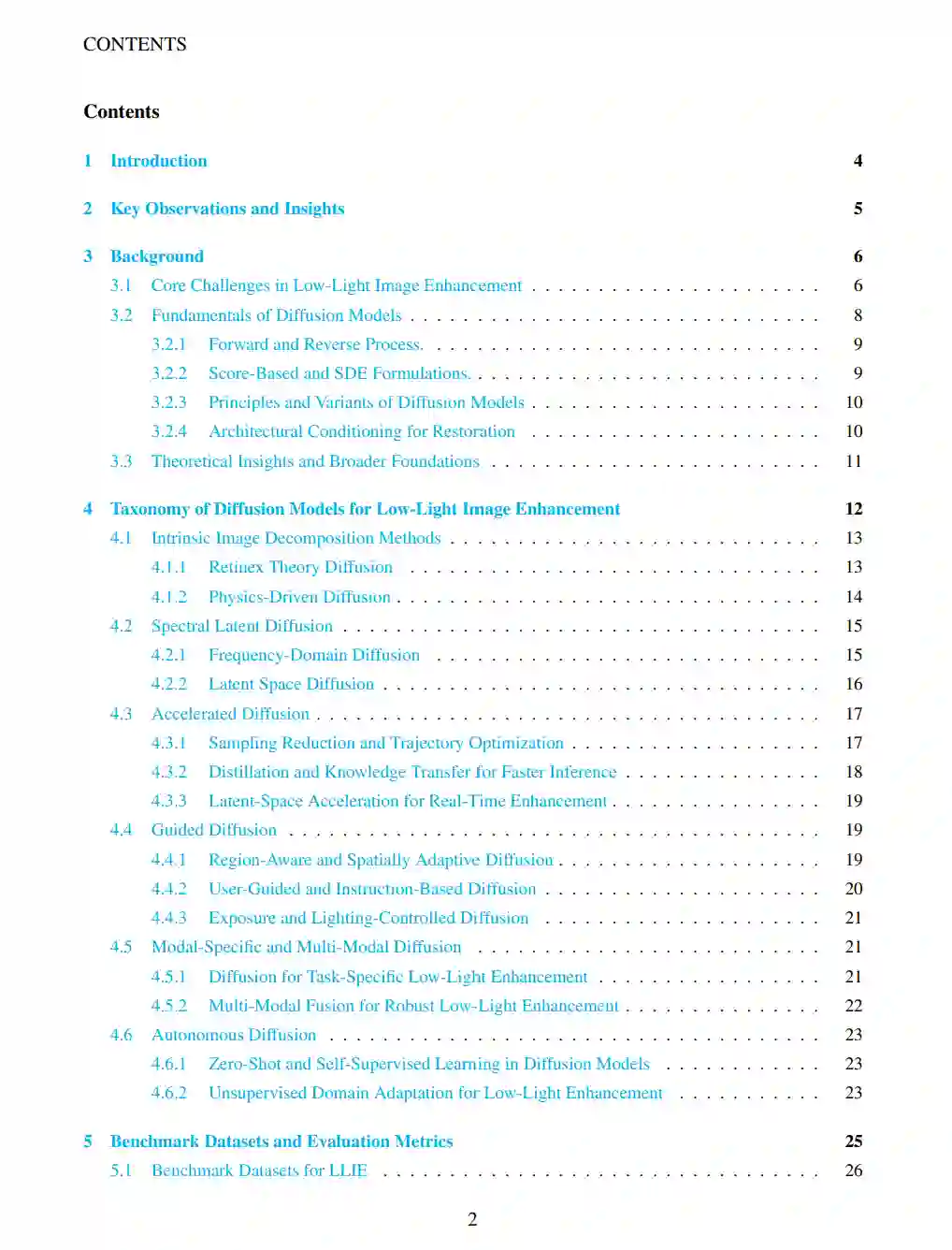 尽管许多方法在特征上存在交叠,我们的分类依据其主要创新轴加以区分,揭示出更宏观的趋势:向实时高效、可控及对无配对数据的泛化发展。本文系统分析了各类别下的代表性研究,比较其假设、优缺点,并探讨了跨领域潜在协同(例如与去雾或文本识别任务的结合)。通过此综述,我们不仅综合了近期的进展,也旨在揭示核心科学问题并为未来基于扩散模型的 LLIE 研究提供路线图。 本文余下部分结构如下: * 第 2 节总结并讨论扩散模型相关文献中的重要观察与洞见,为后续综述奠定基础; * 第 3 节介绍 LLIE 的主要挑战与扩散模型的基本原理; * 第 4 节详细阐述我们提出的 LLIE 扩散模型分类体系; * 第 5 节讨论基准数据集与评估指标,并呈现系统的性能分析; * 第 6 节剖析当前存在的挑战与局限; * 第 7 节展望未来研究方向; * 第 8 节给出全文总结。