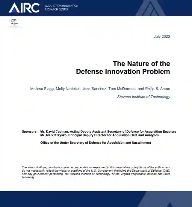 美国防部(DoD)要求美国采购创新研究中心(AIRC)评估其创新问题。这项工作的起因是美国防部一直在努力有效地参与创新生态系统,以支持改进采购、能力和军事成果。AIRC考虑了现有的方法,这些方法主要侧重于流程解决方案和设立新的办事处。显然,挑战依然存在。因此,AIRC退后一步,明确界定问题、其原因和挑战,以及潜在的补救措施,而不是冒着风险盲目地寻找和追逐快速或简单的解决方案,因为这些解决方案可能无法从根本上解决获取和部署正确的创新国防能力的问题。因此,本报告试图从最初的原则出发来审视这一挑战,并真正理解国防创新问题的本质。