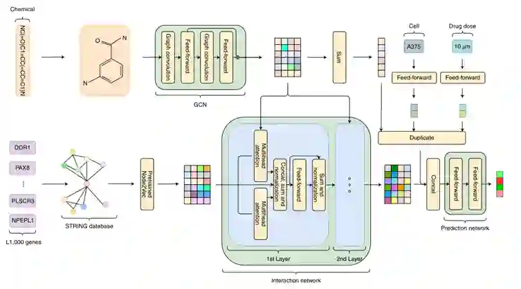 本文建立的模型由多个模块组成,首先,作者使用GCN网络提取药物的特征,并使用前馈神经网络量化细胞系和药物剂量特征,同时,作者基于STRING数据库基于Node2Vec方法将基因数据编码为向量表示。然后将这些向量输入到使用了注意力机制的相互作用网络中,以此来捕获药物-基因、基因-基因间的关联。最后,将各模块输出的向量输入到预测模块中,预测所有基因的表达值。模型的总体结构见图2。 图2.模型总体结构****3.2.2 GCN模型
