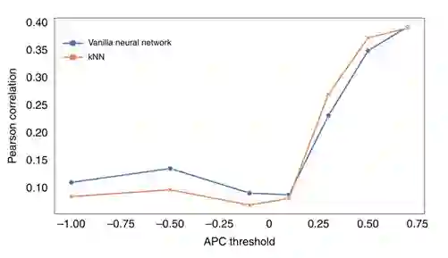 表2中已经可以大概看出模型的性能受数据集质量影响,本小节作者基于vanilla神经网络和kNN算法更加细致地探讨了数据集质量对模型性能的影响,结果如图5所示。在APC值小于0.1时,模型在预测时的结果基本没有可靠性,当APC值大于0.1时模型渐渐起作用,并随着APC值的升高模型的性能也在不断升高。这些结果表明不可靠的数据对模型预测的性能有严重的负面影响,从数据集中去除这部分数据是实现良好预测性能的必要条件。