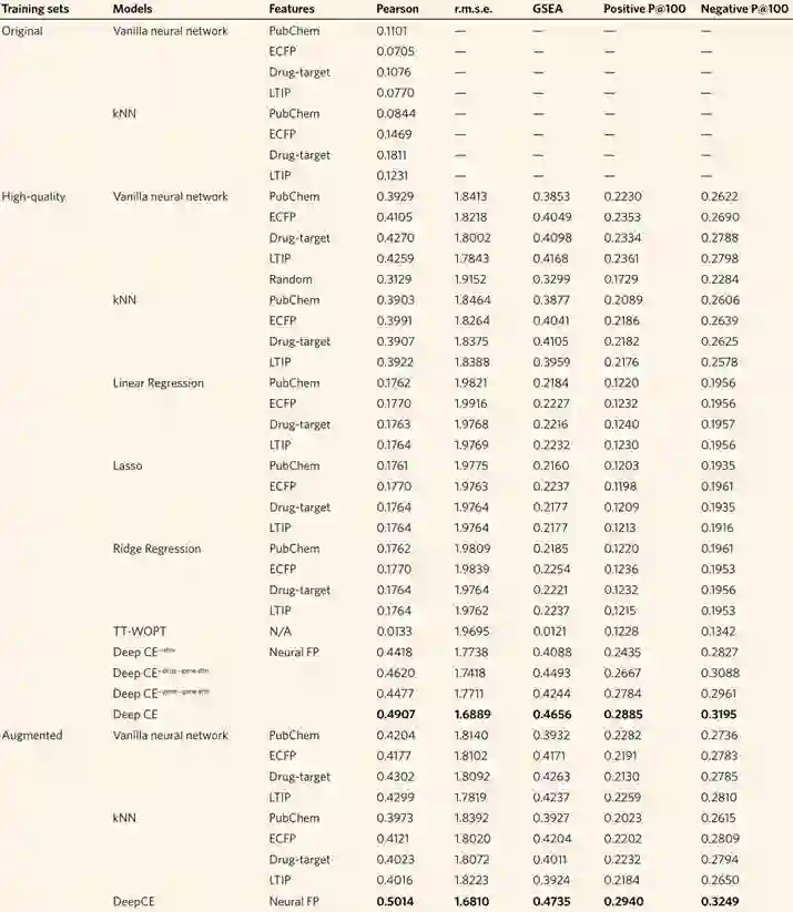 作者将DeepCE及其几个变体与几个基线模型进行了比较,包括vanilla神经网络、kNN、线性模型和TT-WOPT。DeepCE的几个变体分别为DeepCE 对于DeepCE,作者使用神经指纹(neural fingerprints,及前述通过GCN得出的药物特征)作为药物特征的描述方法,而对于其他模型,作者使用的是预定义的化学指纹,包括PubChem、ECFP6指纹和药物靶点信息。所有模型都在高质量数据集上训练、验证。 如表2所示,DeepCE及其变体的性能比基准模型有了极大的提升。特别是DeepCE模型在测试集上获得了0.4907的Person相关性,大大超过了其他模型。与去除了相互作用模块的简单变体相比,DeepCE也取得了更好的性能,表证明了对化学结构-基因和基因-基因之间特征的关联性进行建模的有效性。在基准模型中,vanilla神经网络和kNN取得了较好的分数,而线性回归、Lasso回归、TT-WOPT和岭回归表现极差,基本没什么作用。这表明线性关系不足以对此数据集中变量之间的依赖关系进行建模。4.2 化学相似性对模型预测性能有影响