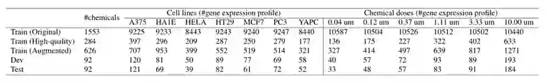 本文用到的数据集有如下几个: LINCS L1000**:****LINCS L1000数据集包含不同基因在不同剂量、不同药物、不同细胞下的表达谱,本文使用该数据集训练、验证DeepCE和其他模型。原始的L1000质量较低,有一些技术可以提高此数据集的质量,如高斯混合,本文使用的是基于贝叶斯的峰值反卷积技术处理后,根据L1000中Level 4的数据筛选出的高质量Level 5数据集,筛选方法为计算二者之间的平均Pearson相关系数(APC),选择APC分数大于等于0.7的样本作为高质量数据。最后本文将高质量数据集分成了训练集、验证集和测试集,各数据集详情如表1所示。其中,augmented 的数据集将在下文描述。表1.L1000数据集详情