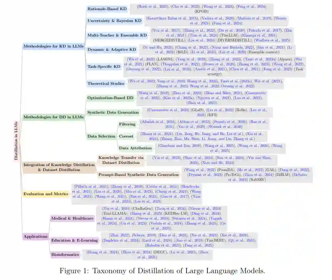 此外,我们强调了蒸馏技术在医疗、教育等领域的应用,这些技术使得高效部署成为可能,同时不牺牲性能。尽管已有大量进展,但仍存在一些开放性挑战,例如:如何在压缩过程中保持新兴推理能力和语言多样性,如何高效适应持续演变的教师模型与数据集,以及如何建立全面的评估协议。 通过综合方法创新、理论基础和实践洞见,本综述为通过更加紧密整合 KD 和 DD 原则,实现可持续、资源高效的大型语言模型,描绘了一条清晰的发展路径。 关键词:大型语言模型、知识蒸馏、数据集蒸馏、效率、模型压缩、综述