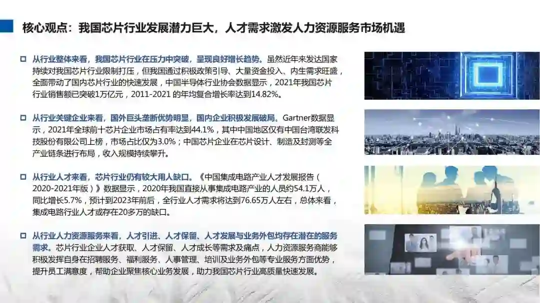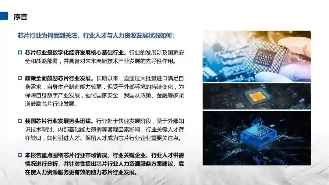 芯片行业为何受到关注,行业人才与人力资源发展状况如何:芯片行业是数字化经济发展核心基础行业。行业的发展涉及国家安全和战略部署,并具备对未来高新技术产业发展的先导性作用。□政策全面鼓励芯片行业发展。长期以来一直通过大批量进口满足自身需求,自身生产制造能力较弱,但受于外部环境的持续变化,为保障自身数字产业发展,强化国家安全,我国从政策、金融等多渠道鼓励芯片行业发展。我国芯片行业发展势头迅猛。行业处于快速发展阶段,受于外部知识技术掣肘、内部基础能力薄弱等客观因素影响,行业关键人才存在缺口,如何引进人才、保留人才成为芯片行业企业重要关注点。本报告重点围绕芯片行业市场情况、行业关键企业、行业人才供需情况进行分析,并针对性提出芯片行业人力资源服务方案建议,意在使人力资源服务更有效的助力芯片行业发展。