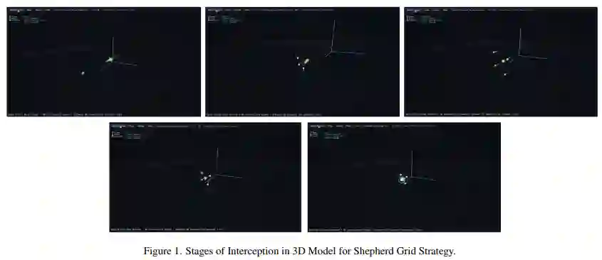 现代无人机威胁需依托先进拦截策略应对复杂规避能力与对抗环境。传统单拦截器及非协同多拦截器方案存在固有缺陷:覆盖不足、追踪模式可预测、易受智能规避机动反制。本文提出"牧羊人网格"策略——基于群体行为协同的多阶段框架,通过系统性围困与协同打击实现确定性目标拦截。该策略实施四阶段作战模型(追踪/跟随/编组/交战),结合动态角色分配与自适应编队几何学,在保持持续目标压制的同时优化打击时机。核心创新含三大要素:基于目标距离与任务目标的自适应阶段转换机制、专设编队维持与打击执行的动态角色分配系统、适应目标运动模式的预测性编队几何算法。仿真实验显示其性能显著超越传统方案:拦截成功率提升至近完美水平(>95% vs 传统方案65%),中位拦截耗时同步缩减。